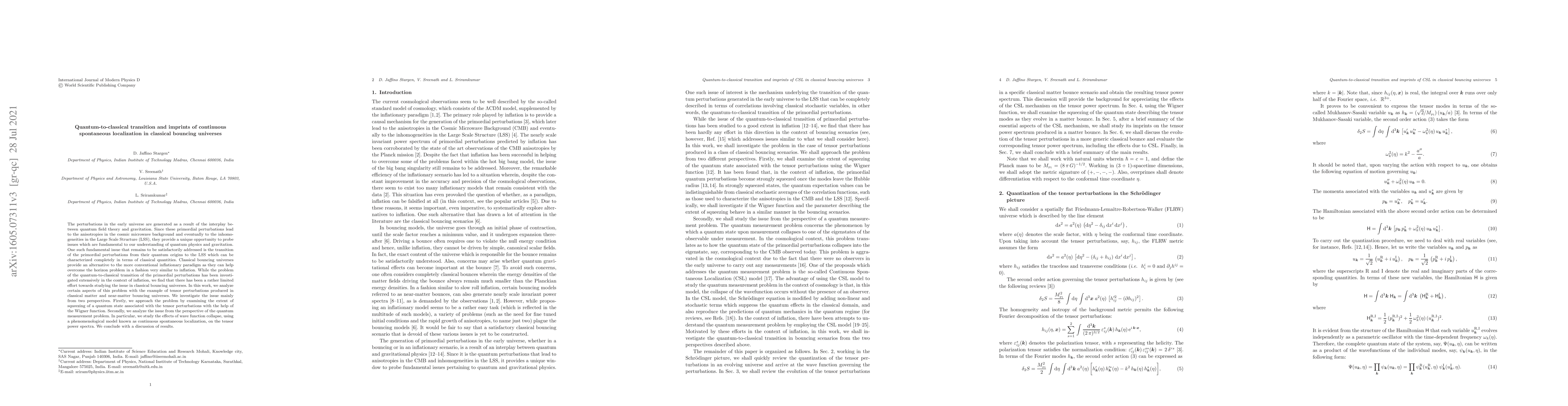 This paper investigates the quantum-to-classical transition of primordial perturbations in classical bouncing universes, contrasting with the inflationary paradigm. It explores tensor perturbations through squeezing analysis and continuous spontaneous localization to understand their transition from quantum to classical states.