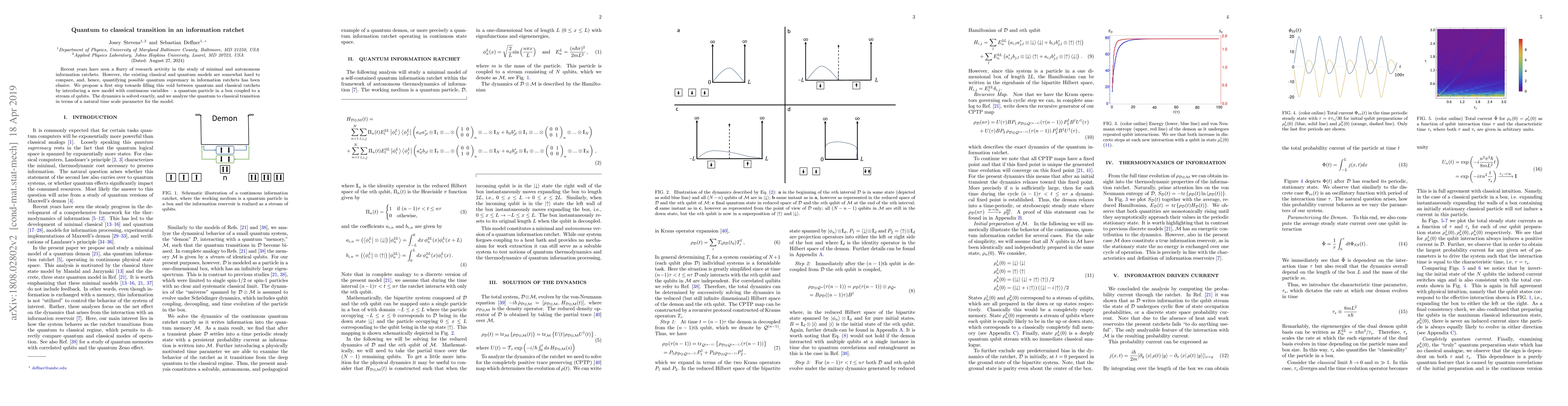 Recent years have seen a flurry of research activity in the study of minimal and autonomous information ratchets. However, the existing classical and quantum models are somewhat hard to compare, and, hence, quantifying possible quantum supremacy in information ratchets has been elusive. We propose a first step towards filling this void between quantum and classical ratchets by introducing a new model with continuous variables -- a quantum particle in a box coupled to a stream of qubits. The dynamics is solved exactly, and we analyze the quantum to classical transition in terms of a natural time scale parameter for the model.