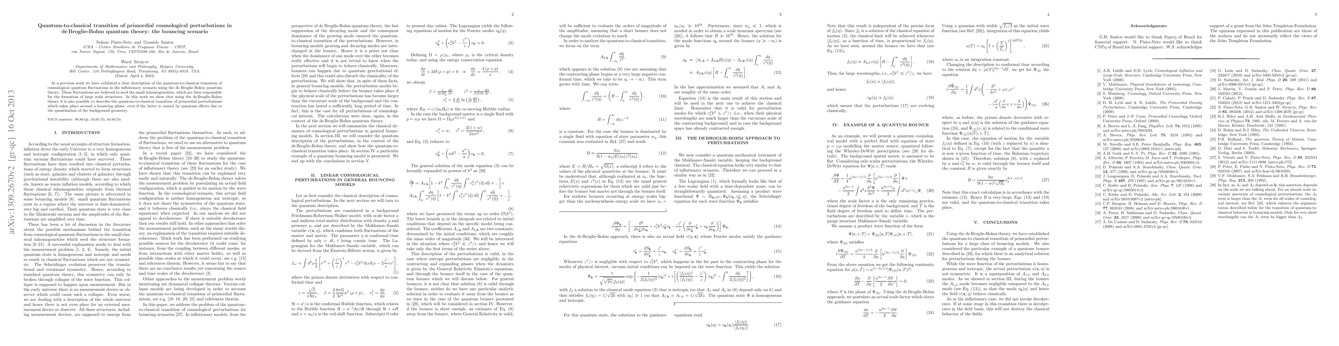 This paper demonstrates how de Broglie-Bohm quantum theory can describe the quantum-to-classical transition of primordial cosmological perturbations, particularly around a bouncing phase, extending previous findings in the inflationary scenario. It highlights the role of quantum effects in shaping large-scale structures through these perturbations.