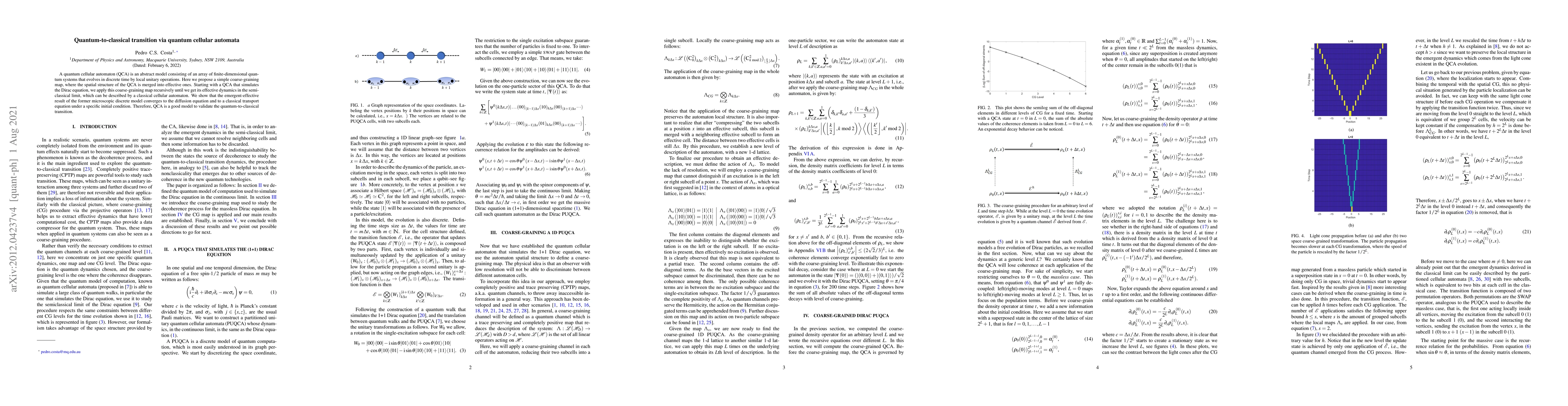 A quantum cellular automaton (QCA) is an abstract model consisting of an array of finite-dimensional quantum systems that evolves in discrete time by local unitary operations. Here we propose a simple coarse-graining map, where the spatial structure of the QCA is merged into effective ones. Starting with a QCA that simulates the Dirac equation, we apply this coarse-graining map recursively until we get its effective dynamics in the semiclassical limit, which can be described by a classical cellular automaton. We show that the emergent-effective result of the former microscopic discrete model converges to the diffusion equation and to a classical transport equation under a specific initial condition. Therefore, QCA is a good model to validate the quantum-to-classical transition.