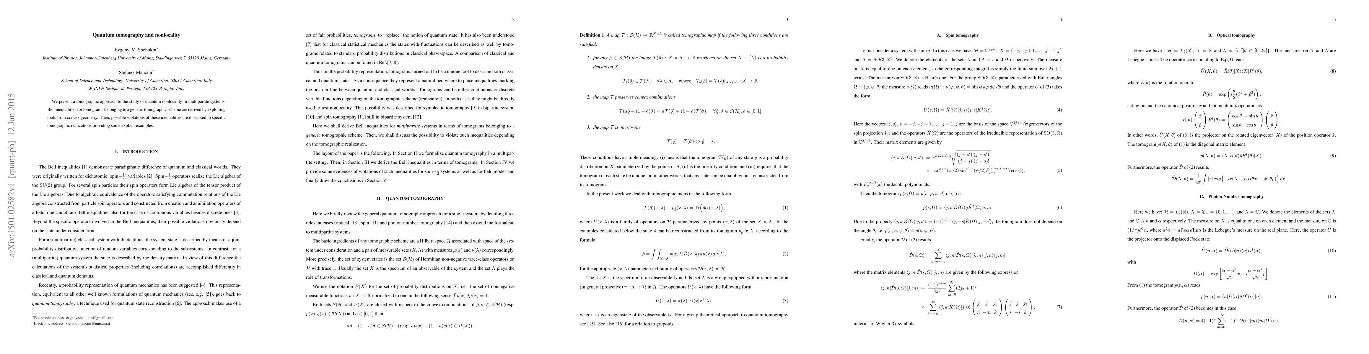 We present a tomographic approach to the study of quantum nonlocality in multipartite systems. Bell inequalities for tomograms belonging to a generic tomographic scheme are derived by exploiting tools from convex geometry. Then, possible violations of these inequalities are discussed in specific tomographic realizations providing some explicit examples.
