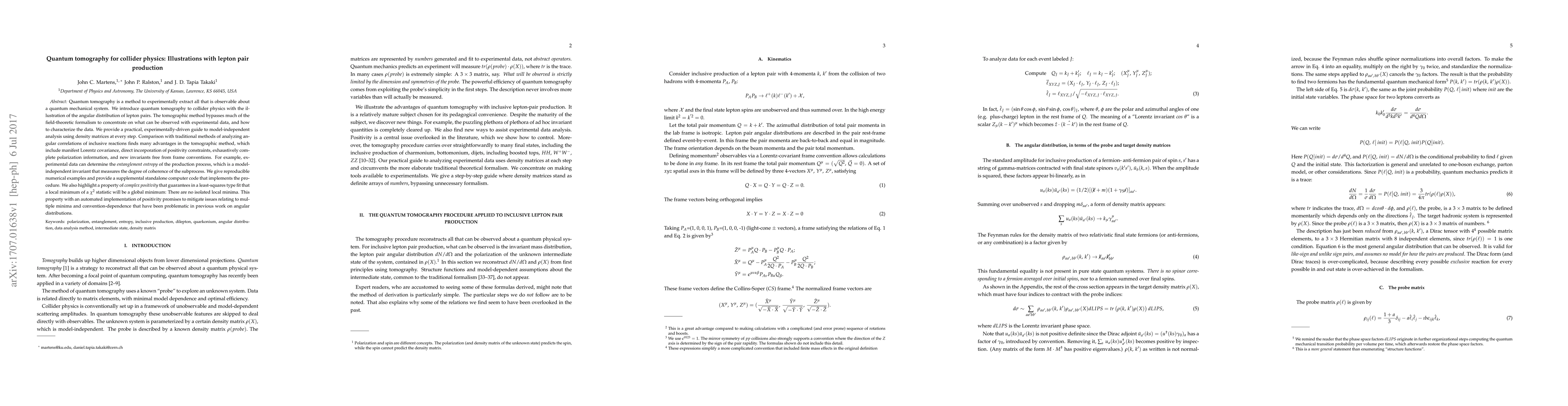This paper introduces quantum tomography to collider physics, demonstrating its application to lepton pair production. It provides a model-independent analysis using density matrices, highlighting advantages such as Lorentz covariance and complete polarization information, and offers a standalone computer code for reproducibility.