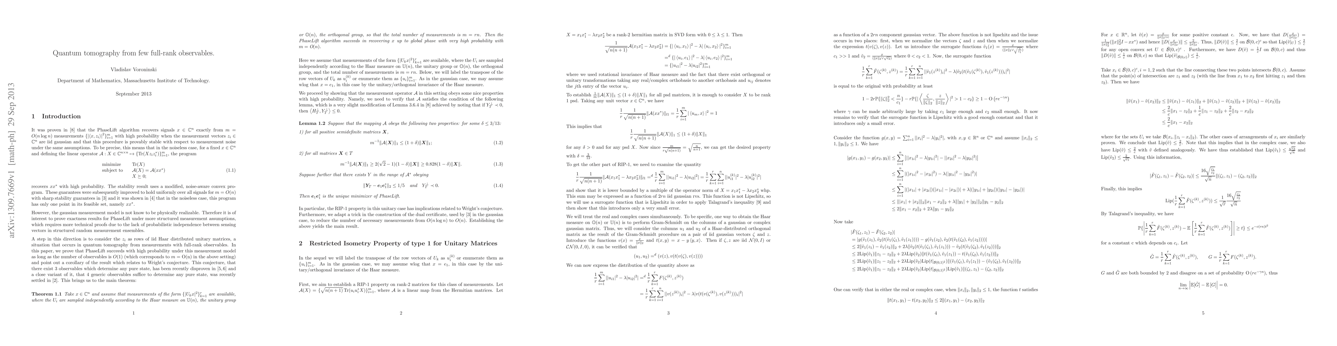 Summary: The PhaseLift algorithm effectively reconstructs pure quantum states using only a constant number of full-rank observables, demonstrating high recovery probability. This method significantly reduces the data requirements for quantum tomography.