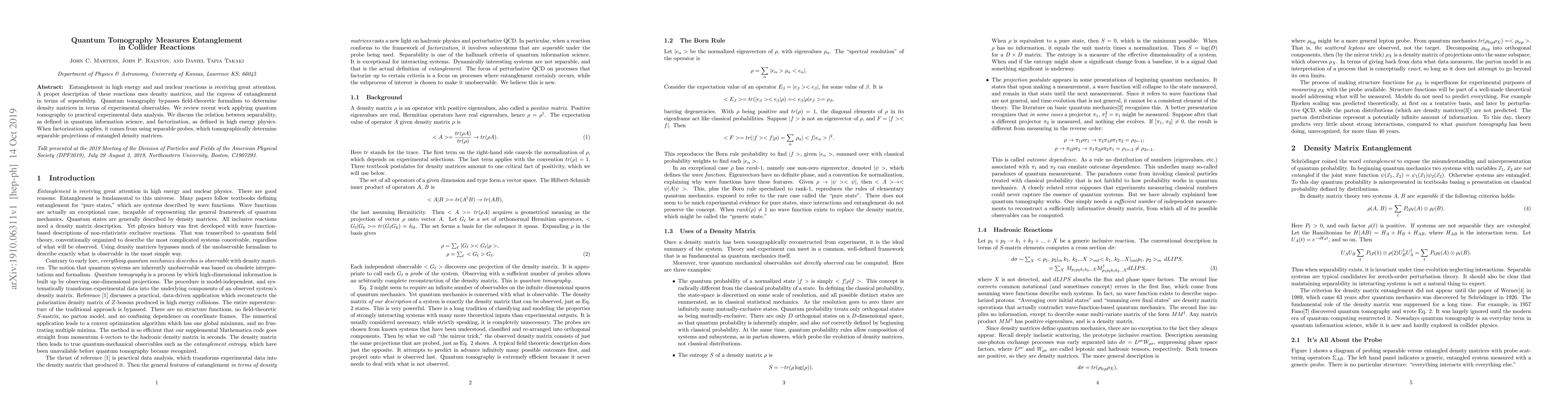 This paper reviews the application of quantum tomography to measure entanglement in high-energy collider reactions, emphasizing its role in bypassing traditional field-theoretic methods. It explores the connection between quantum information science's separability and the factorization used in high-energy physics, highlighting how separable probes can determine separable projections of entangled density matrices.