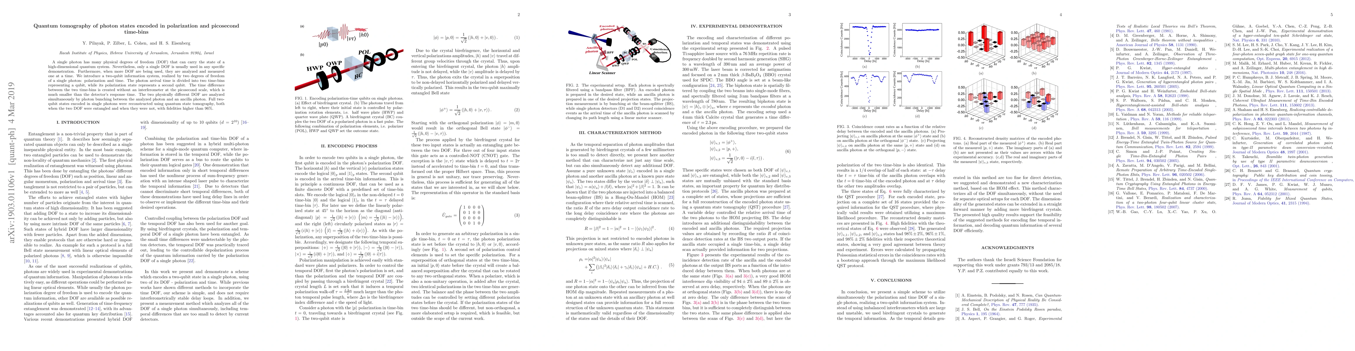 This paper presents a method for quantum tomography of high-dimensional quantum states using a single photon's polarization and picosecond time-bins as two qubits. The time-bin qubit is created at the picosecond scale without an interferometer, allowing simultaneous analysis of both qubits, achieving high fidelity reconstructions of the full two-qubit states.