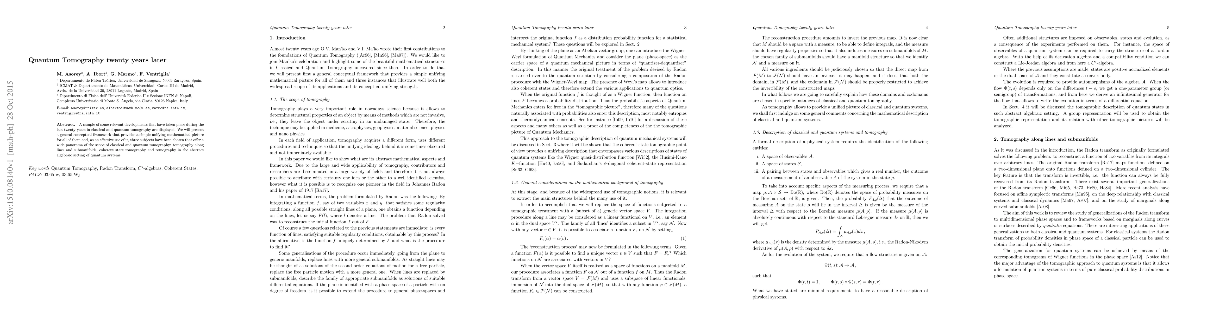 This paper reviews significant advancements in classical and quantum tomography over the past two decades, presenting a unifying mathematical framework. It focuses on three key areas: tomography along lines and submanifolds, coherent state tomography, and tomography in the abstract algebraic setting of quantum systems.