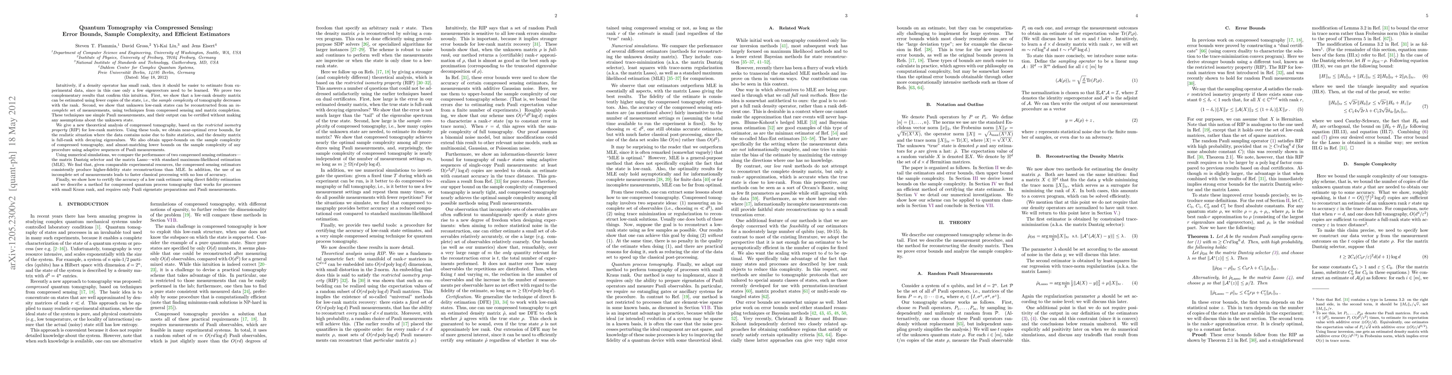 This paper explores quantum tomography via compressed sensing, demonstrating that low-rank density matrices can be estimated with fewer samples and incomplete measurements. The authors provide theoretical error bounds and sample complexity analyses, showing that compressed sensing techniques outperform standard maximum-likelihood estimation in terms of both fidelity and computational efficiency.