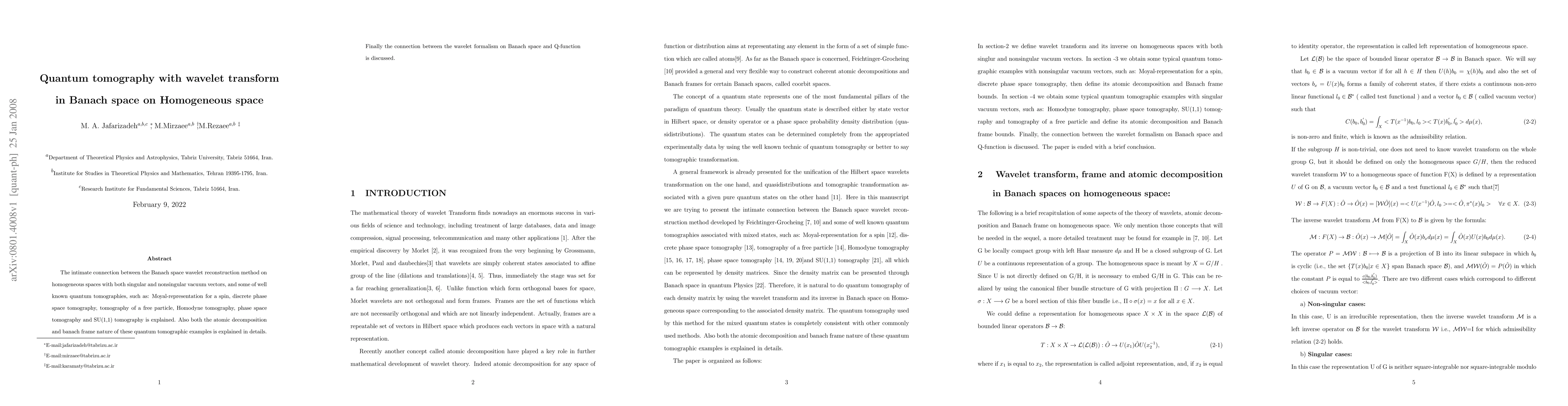 The intimate connection between the Banach space wavelet reconstruction method on homogeneous spaces with both singular and nonsingular vacuum vectors, and some of well known quantum tomographies, such as: Moyal-representation for a spin, discrete phase space tomography, tomography of a free particle, Homodyne tomography, phase space tomography and SU(1,1) tomography is explained. Also both the atomic decomposition and banach frame nature of these quantum tomographic examples is explained in details. Finally the connection between the wavelet formalism on Banach space and Q-function is discussed.
