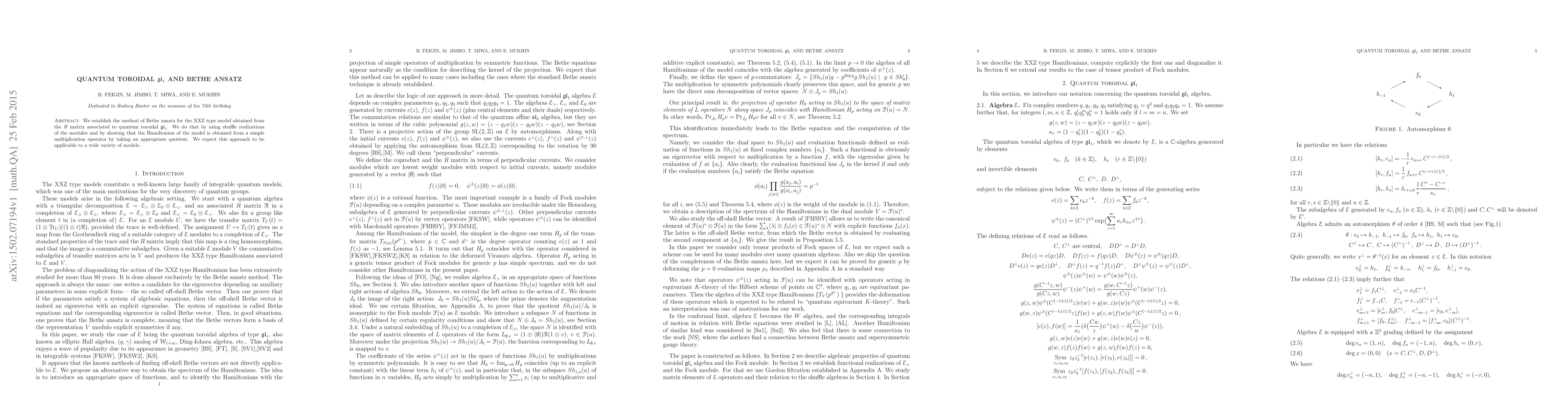 We establish the method of Bethe ansatz for the XXZ type model obtained from the R-matrix associated to quantum toroidal gl(1). We do that by using shuffle realizations of the modules and by showing that the Hamiltonian of the model is obtained from a simple multiplication operator by taking an appropriate quotient. We expect this approach to be applicable to a wide variety of models.