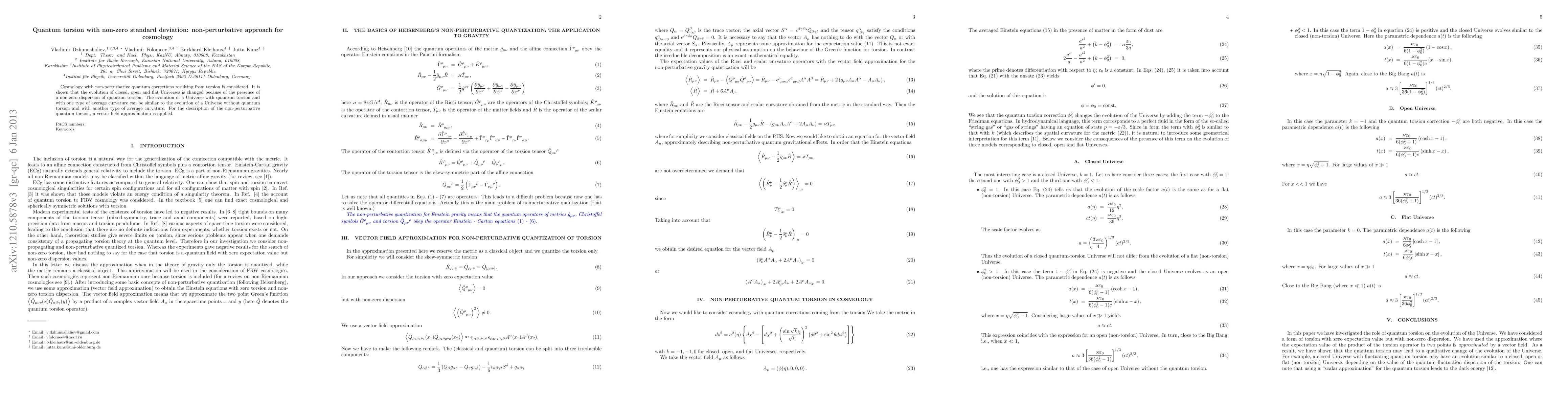 Cosmology with non-perturbative quantum corrections resulting from torsion is considered. It is shown that the evolution of closed, open and flat Universes is changed because of the presence of a non-zero dispersion of quantum torsion. The evolution of a Universe with quantum torsion and with one type of average curvature can be similar to the evolution of a Universe without quantum torsion and with another type of average curvature. For the description of the non-perturbative quantum torsion, a vector field approximation is applied.