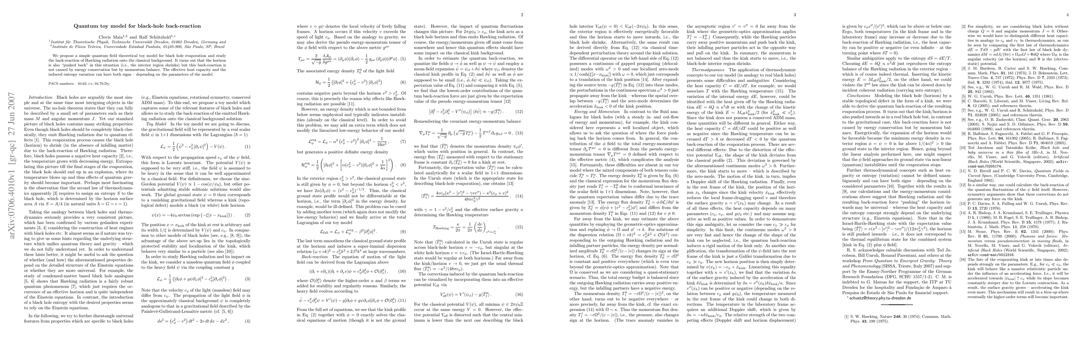We propose a simple quantum field theoretical toy model for black hole evaporation and study the back-reaction of Hawking radiation onto the classical background. It turns out that the horizon is also ``pushed back'' in this situation (i.e., the interior region shrinks) but this back-reaction is not caused by energy conservation but by momentum balance. The effective heat capacity and the induced entropy variation can have both signs -- depending on the parameters of the model. PACS: 04.62.+v, 04.70.Dy.