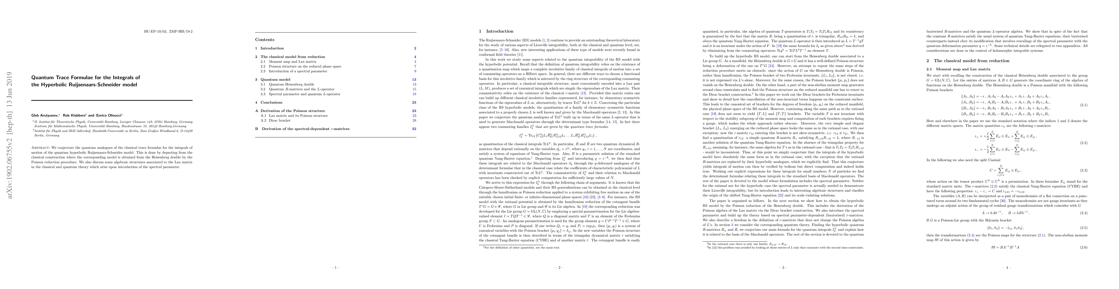 We conjecture the quantum analogue of the classical trace formulae for the integrals of motion of the quantum hyperbolic Ruijsenaars-Schneider model. This is done by departing from the classical construction where the corresponding model is obtained from the Heisenberg double by the Poisson reduction procedure. We also discuss some algebraic structures associated to the Lax matrix in the classical and quantum theory which arise upon introduction of the spectral parameter.