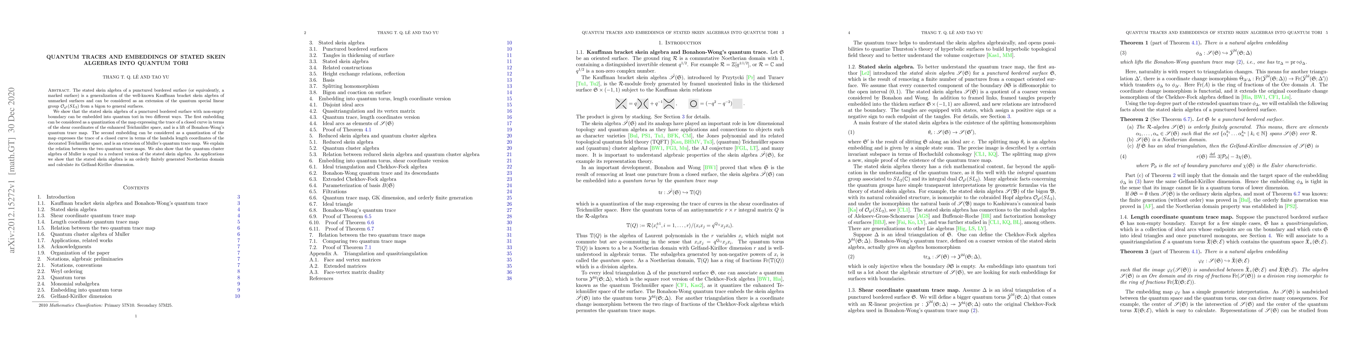 The paper introduces novel embeddings of stated skein algebras into quantum tori, linking quantum trace maps to shear and lambda length coordinates, and equating Muller's quantum cluster algebra with a reduced stated skein algebra.