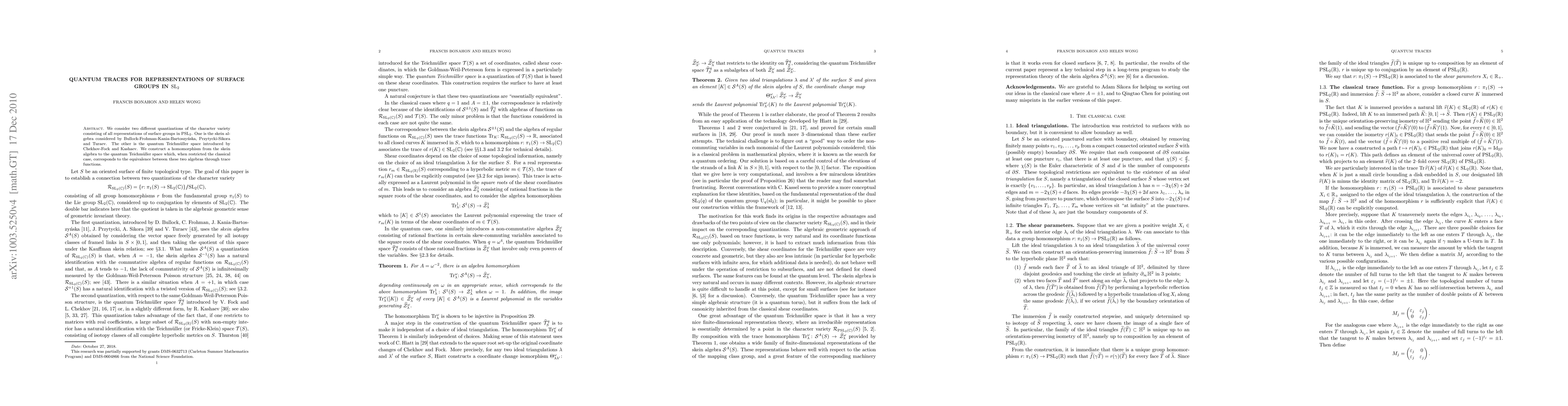We consider two different quantizations of the character variety consisting of all representations of surface groups in SL_2. One is the skein algebra considered by Przytycki-Sikora and Turaev. The other is the quantum Teichmuller space introduced by Chekhov-Fock and Kashaev. We construct a homomorphism from the skein algebra to the quantum Teichmuller space which, when restricted the classical case, corresponds to the equivalence between these two algebras through trace functions.