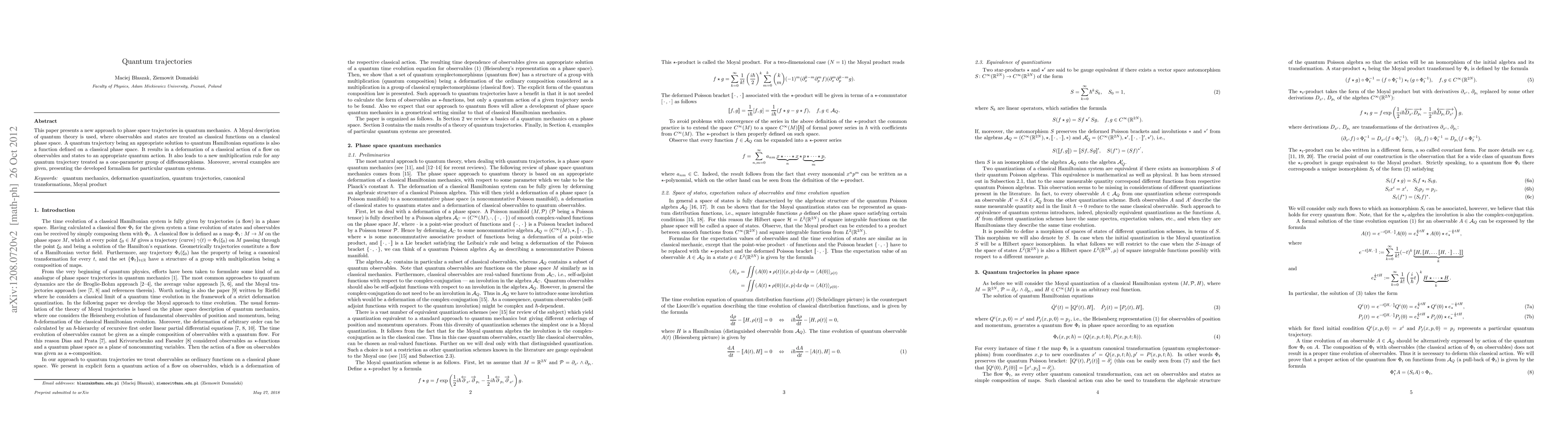 This paper presents a new approach to phase space trajectories in quantum mechanics. A Moyal description of quantum theory is used, where observables and states are treated as classical functions on a classical phase space. A quantum trajectory being an appropriate solution to quantum Hamiltonian equations is also a function defined on a classical phase space. The difference, when compare with classical theory, is in a deformation of a classical action of a flow on observables and states to an appropriate quantum action. This leads also to deformation of a multiplication rule for any quantum trajectory treated as a one-parameter group of diffeomorphisms. Moreover, several examples are given, presenting the developed formalism for particular quantum systems.