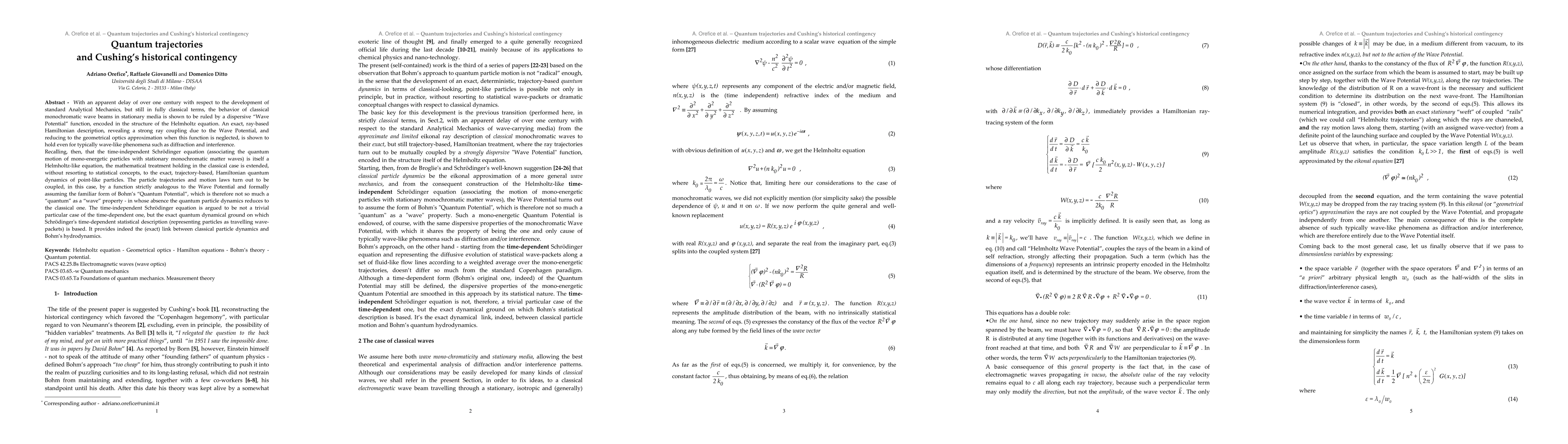 With an apparent delay of over one century with respect to the development of standard Analytical Mechanics, but still in fully classical terms, the behavior of classical monochromatic wave beams in stationary media is shown to be ruled by a dispersive "Wave Potential" function, encoded in the structure of the Helmholtz equation. An exact, ray-based Hamiltonian description, revealing a strong ray coupling due to the Wave Potential, and reducing to the geometrical optics approximation when this function is neglected, is shown to hold even for typically wave-like phenomena such as diffraction and interference. Recalling, then, that the time-independent Schroedinger equation (associating the quantum motion of mono-energetic particles with stationary monochromatic matter waves) is itself a Helmholtz-like equation, the mathematical treatment holding in the classical case is extended, without resorting to statistical concepts, to the exact, trajectory-based, Hamiltonian quantum dynamics of point-like particles. The particle trajectories and motion laws turn out to be coupled, in this case, by a function strictly analogous to the Wave Potential and formally assuming the familiar form of Bohm's "Quantum Potential", which is therefore not so much a "quantum" as a "wave" property - in whose absence the quantum particle dynamics reduces to the classical one. The time-independent Schroedinger equation is argued to be not a trivial particular case of the time-dependent one, but the exact quantum dynamical ground on which Schroedinger's time-dependent statistical description (representing particles as travelling wave-packets) is based. It provides indeed the (exact) link between classical particle dynamics and Bohm's hydrodynamics.