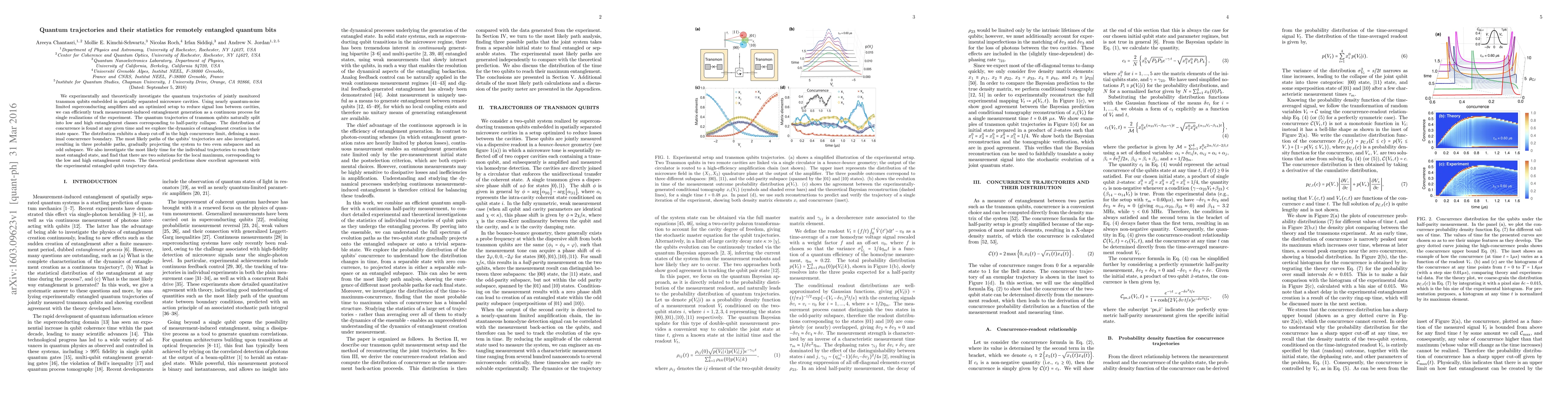We experimentally and theoretically investigate the quantum trajectories of jointly monitored transmon qubits embedded in spatially separated microwave cavities. Using nearly quantum-noise limited superconducting amplifiers and an optimized setup to reduce signal loss between cavities, we can efficiently track measurement-induced entanglement generation as a continuous process for single realizations of the experiment. The quantum trajectories of transmon qubits naturally split into low and high entanglement classes corresponding to half-parity collapse. The distribution of concurrence is found at any given time and we explore the dynamics of entanglement creation in the state space. The distribution exhibits a sharp cut-off in the high concurrence limit, defining a maximal concurrence boundary. The most likely paths of the qubits' trajectories are also investigated, resulting in three probable paths, gradually projecting the system to two even subspaces and an odd subspace. We also investigate the most likely time for the individual trajectories to reach their most entangled state, and find that there are two solutions for the local maximum, corresponding to the low and high entanglement routes. The theoretical predictions show excellent agreement with the experimental entangled qubit trajectory data.