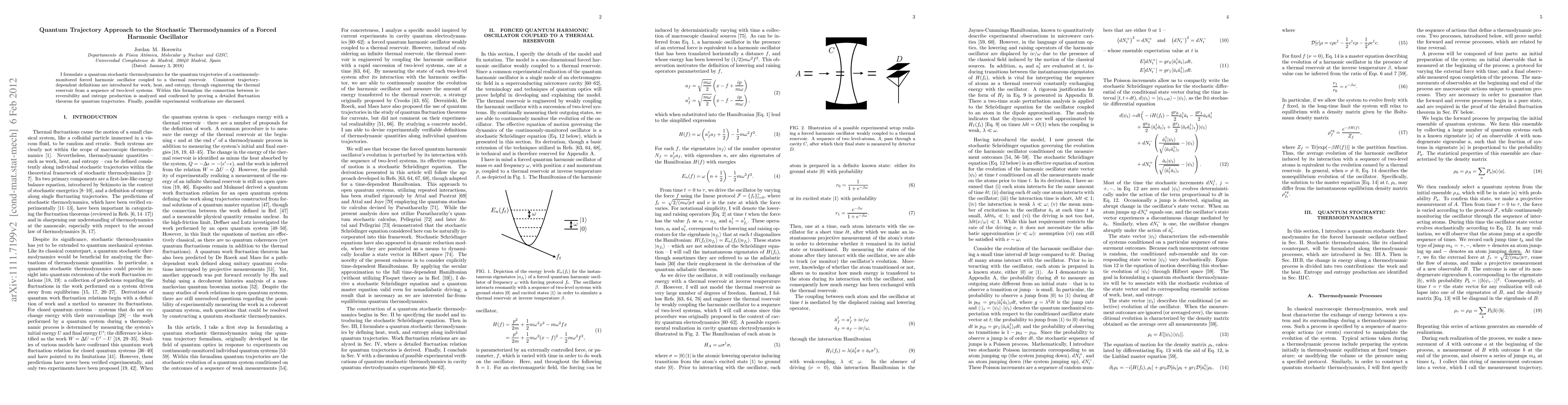 This paper develops a quantum stochastic thermodynamics framework for a monitored forced harmonic oscillator, introducing trajectory-dependent definitions for work, heat, and entropy. It confirms the link between irreversibility and entropy production via a detailed fluctuation theorem and discusses potential experimental verifications.