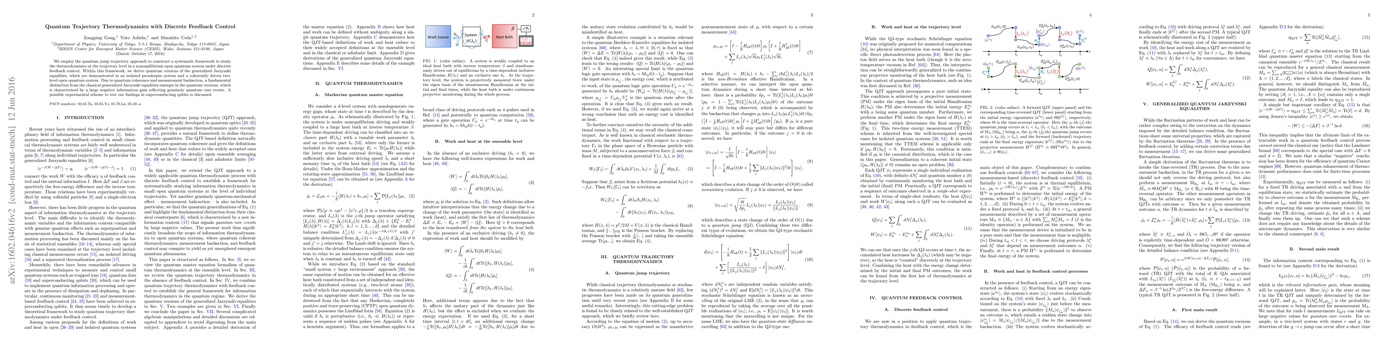 This paper develops a quantum trajectory framework to study thermodynamics in nonequilibrium open quantum systems under discrete feedback control, deriving quantum versions of generalized Jarzynski equalities. It highlights a fundamental quantum distinction from classical versions due to coherence and measurement effects.