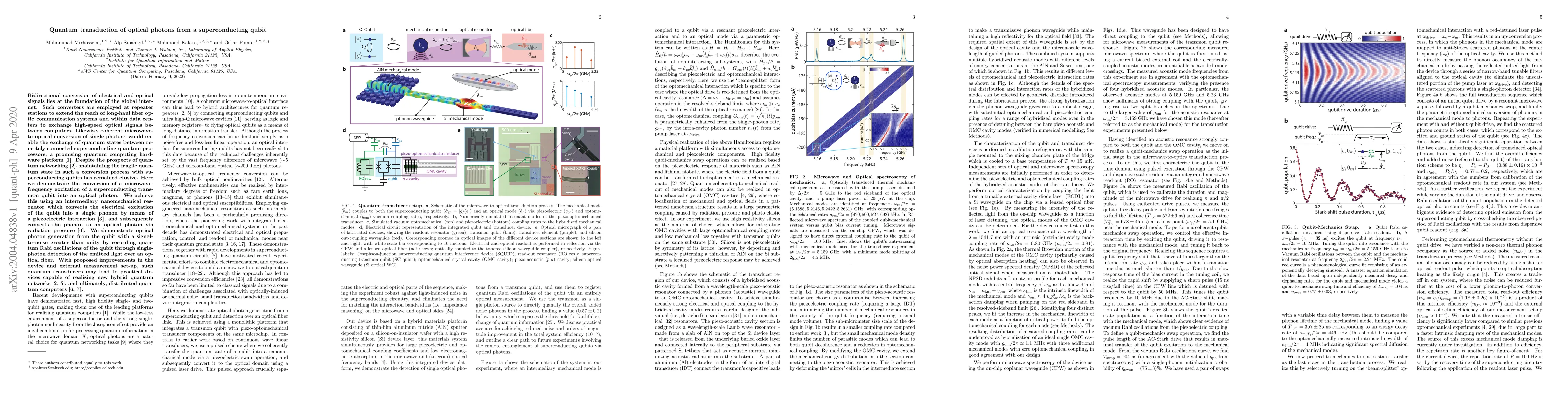 Bidirectional conversion of electrical and optical signals lies at the foundation of the global internet. Such converters are employed at repeater stations to extend the reach of long-haul fiber optic communication systems and within data centers to exchange high-speed optical signals between computers. Likewise, coherent microwave-to-optical conversion of single photons would enable the exchange of quantum states between remotely connected superconducting quantum processors, a promising quantum computing hardware platform. Despite the prospects of quantum networking, maintaining the fragile quantum state in such a conversion process with superconducting qubits has remained elusive. Here we demonstrate the conversion of a microwave-frequency excitation of a superconducting transmon qubit into an optical photon. We achieve this using an intermediary nanomechanical resonator which converts the electrical excitation of the qubit into a single phonon by means of a piezoelectric interaction, and subsequently converts the phonon to an optical photon via radiation pressure. We demonstrate optical photon generation from the qubit with a signal-to-noise greater than unity by recording quantum Rabi oscillations of the qubit through single-photon detection of the emitted light over an optical fiber. With proposed improvements in the device and external measurement set-up, such quantum transducers may lead to practical devices capable of realizing new hybrid quantum networks, and ultimately, distributed quantum computers.