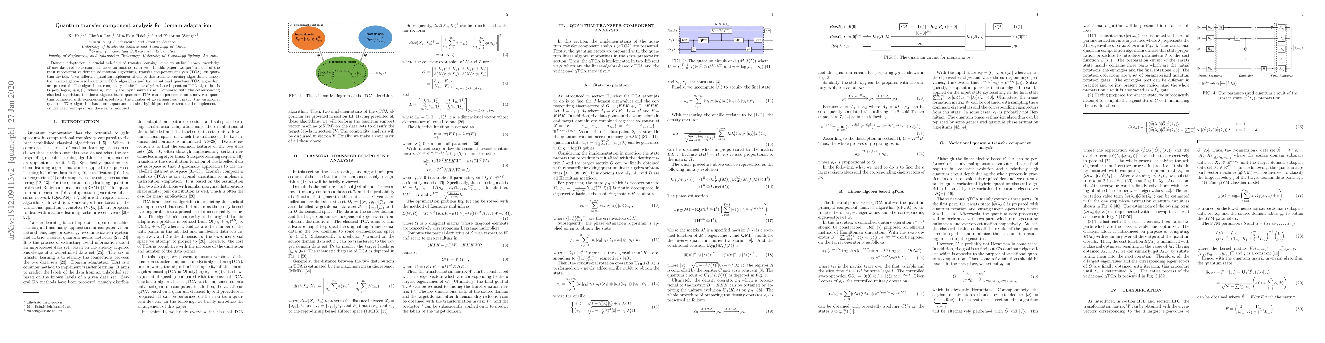 This paper explores quantum implementations of transfer component analysis (TCA) for domain adaptation, presenting both linear-algebra-based and variational quantum TCA algorithms. The linear-algebra-based version offers exponential speedup on universal quantum computers, while the variational version is suitable for near-term quantum devices.