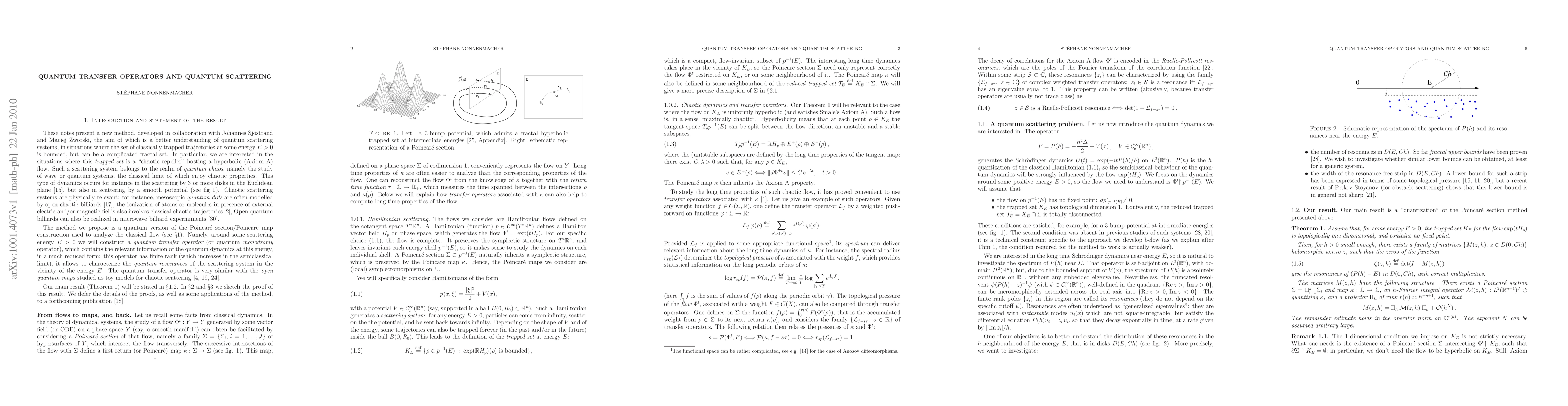 These notes describe a new method to investigate the spectral properties if quantum scattering Hamiltonians, developed in collaboration with J. Sj\"ostrand and M.Zworski. This method consists in constructing a family of "quantized transfer operators" $\{M(z,h)\}$ associated with a classical Poincar\'e section near some fixed classical energy E. These operators are finite dimensional, and have the structure of "open quantum maps". In the semiclassical limit, the family $\{M(z,h)\}$ encode the quantum dynamics near the energy E. In particular, the quantum resonances of the form $E+z$, for $z=O(h)$, are obtained as the roots of $\det(1-M(z,h))=0$.