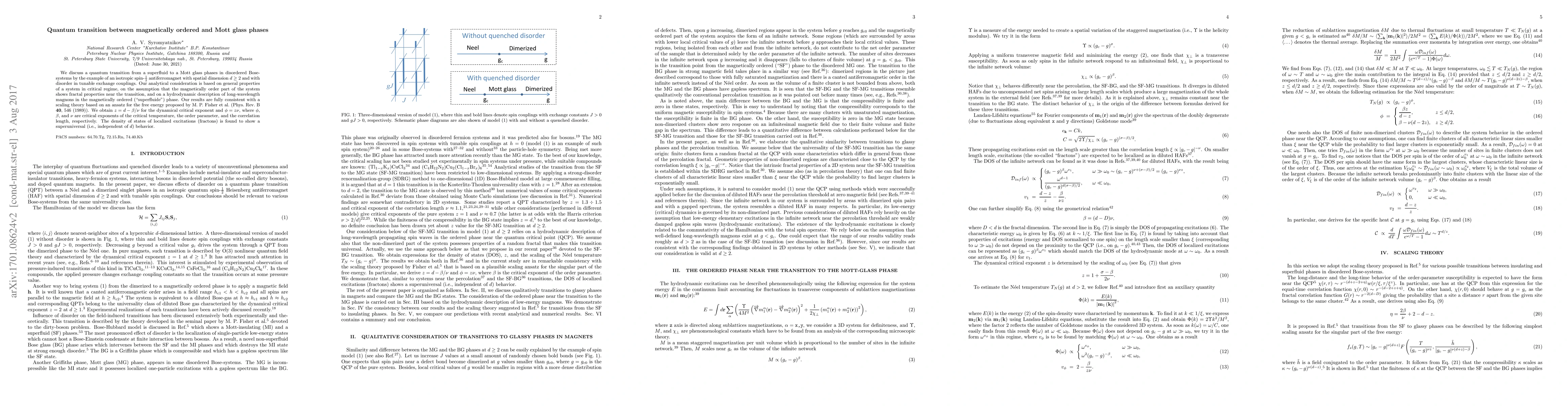 We discuss a quantum transition from a superfluid to a Mott glass phases in disordered Bose-systems by the example of an isotropic spin-$\frac12$ antiferromagnet with spatial dimension $d\ge2$ and with disorder in tunable exchange couplings. Our analytical consideration is based on general properties of a system in critical regime, on the assumption that the magnetically order part of the system shows fractal properties near the transition, and on a hydrodynamic description of long-wavelength magnons in the magnetically ordered ("superfluide") phase. Our results are fully consistent with a scaling theory based on an ansatz for the free energy proposed by M.P. Fisher et al. (Phys. Rev. B 40, 546 (1989)). We obtain $z=d-\beta/\nu$ for the dynamical critical exponent and $\phi = z\nu$, where $\phi$, $\beta$, and $\nu$ are critical exponents of the critical temperature, the order parameter, and the correlation length, respectively. The density of states of localized excitations (fractons) is found to show a superuniversal (i.e., independent of $d$) behavior.