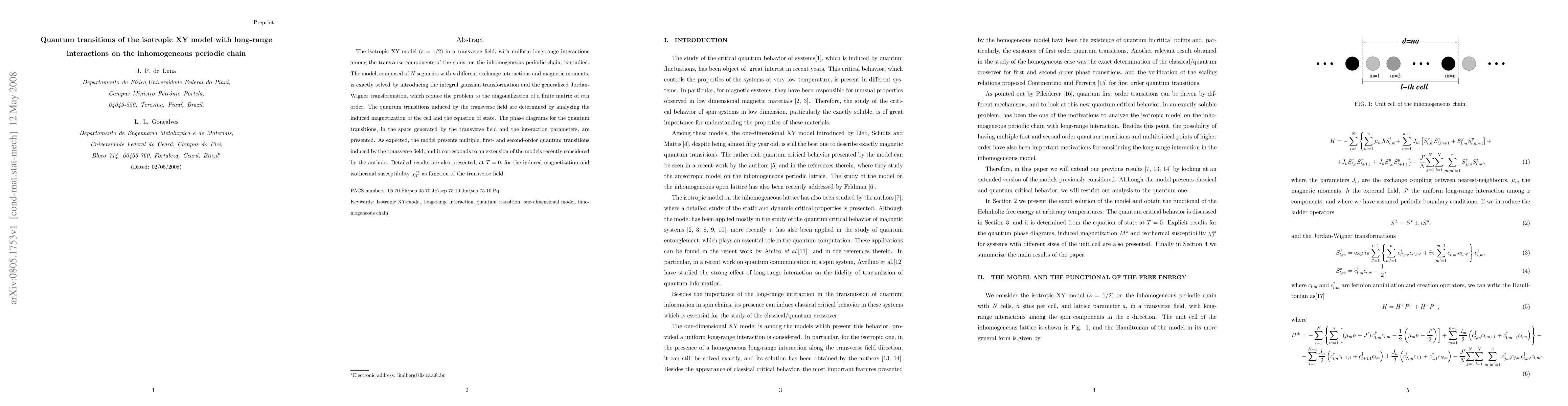This paper exactly solves the XY model with long-range interactions on an inhomogeneous periodic chain, revealing multiple quantum transitions via magnetization analysis and phase diagrams. Results include induced magnetization and isothermal susceptibility at T=0, showcasing first- and second-order transitions.