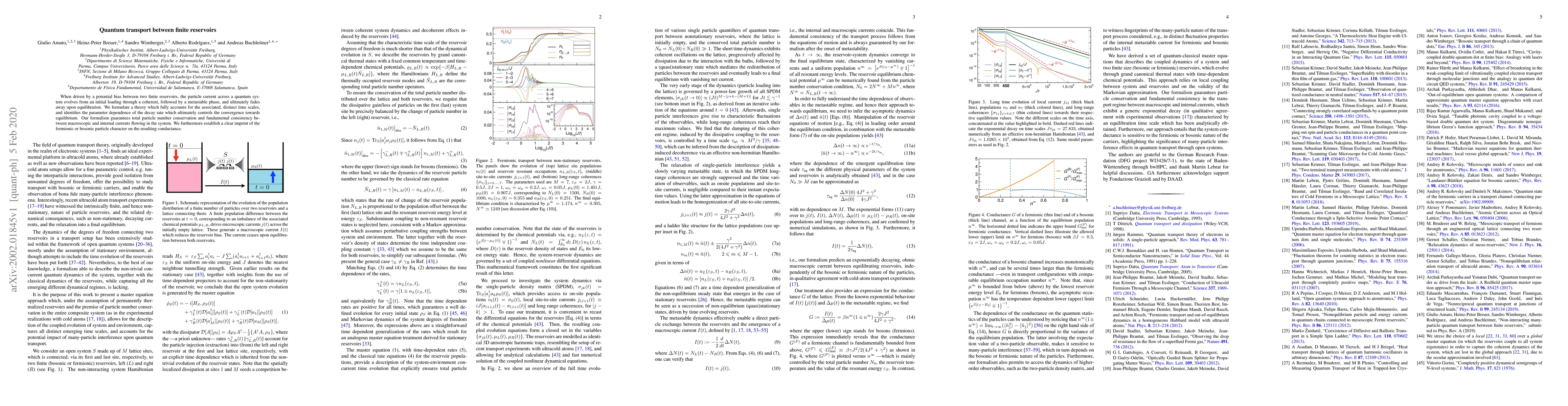 This paper develops a theoretical framework to describe quantum transport dynamics between two finite reservoirs under a potential bias, detailing the transition phases from loading to equilibration and identifying the decay rate's parameter dependence. The theory ensures total particle number conservation and highlights the impact of particle type on the conductance.