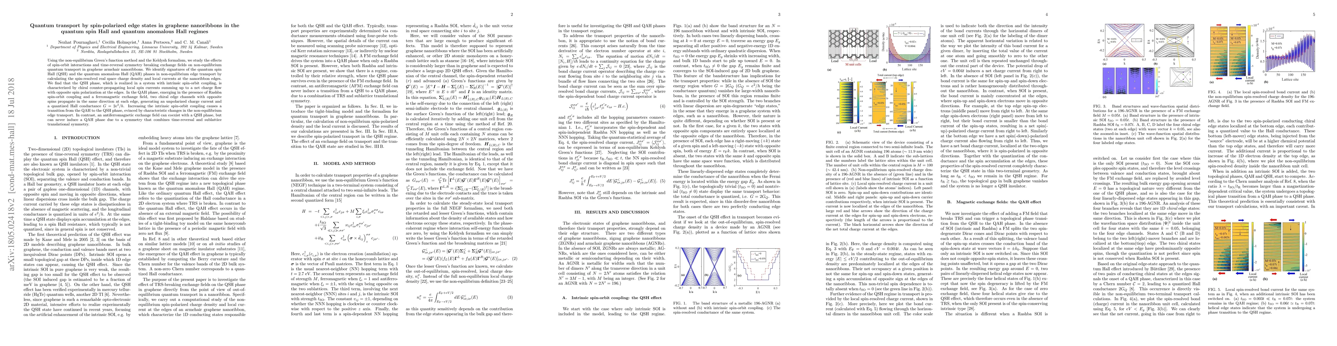 This study employs non-equilibrium Green's functions and Keldysh formalism to analyze quantum transport in graphene nanoribbons, identifying quantum spin Hall (QSH) and quantum anomalous Hall (QAH) phases. The QSH phase features chiral counter-propagating edge spin currents, while the QAH phase exhibits two chiral edge channels with unpolarized charge current and quantized Hall conductance.