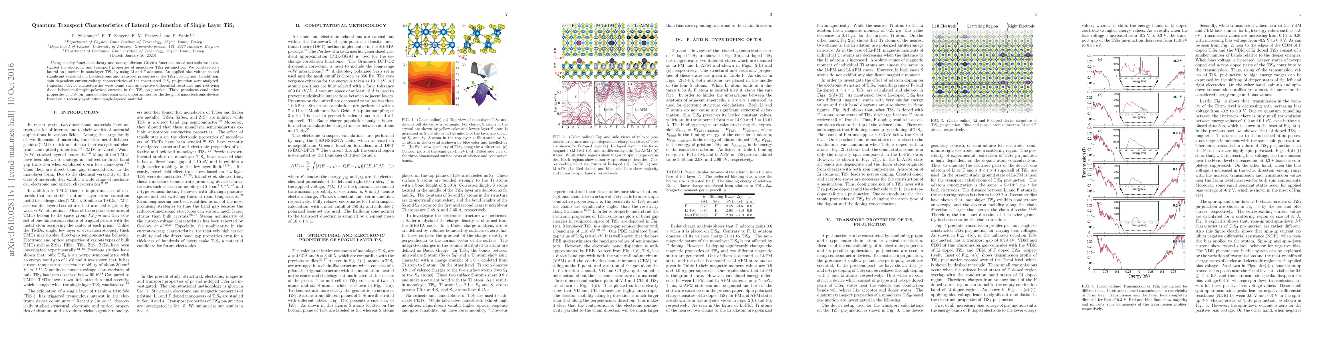Using density functional theory and nonequilibrium Greens functions-based methods we investigated the electronic and transport properties of monolayer TiS3 pn-junction. We constructed a lateral pn-junction in monolayer TiS3 by using Li and F adatoms. An applied bias voltage caused significant variability in the electronic and transport properties of the TiS3 pn-junction. In addition, spin dependent current-voltage characteristics of the constructed TiS3 pn-junction were analyzed. Important device characteristics were found such as negative differential resistance and rectifying diode behaviors for spin-polarized currents in the TiS3 pn-junction. These prominent conduction properties of TiS3 pn-junction offer remarkable opportunities for the design of nanoelectronic devices based on a recently synthesized single-layered material.