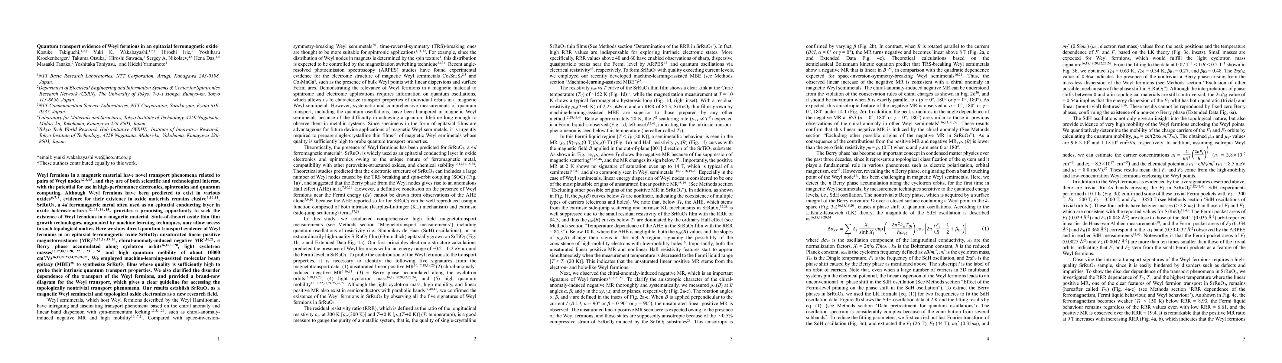 This research paper demonstrates the first direct quantum transport evidence of magnetic Weyl fermions in the epitaxial ferromagnetic oxide SrRuO3, showcasing properties such as unsaturated magnetoresistance and high quantum mobility. The study employs advanced MBE techniques assisted by machine learning to synthesize high-quality SrRuO3 films, establishing it as a magnetic Weyl semimetal and paving the way for new research in topological oxide electronics.