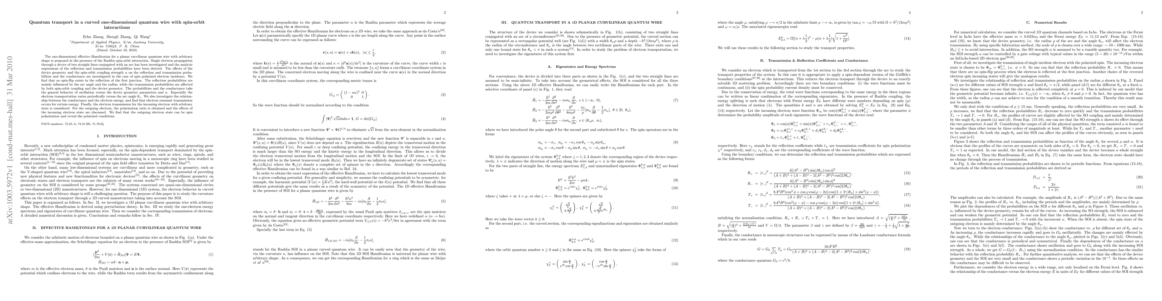 This paper proposes an effective Hamiltonian for a curvilinear quantum wire with Rashba spin-orbit interaction and investigates electron transport through a device consisting of two straight lines connected by an arc. The study reveals that the reflection and transmission probabilities, as well as conductance, oscillate with device geometry and spin-orbit coupling strength, showing periodic variations with the arc angle and resonant transmission at specific energies.