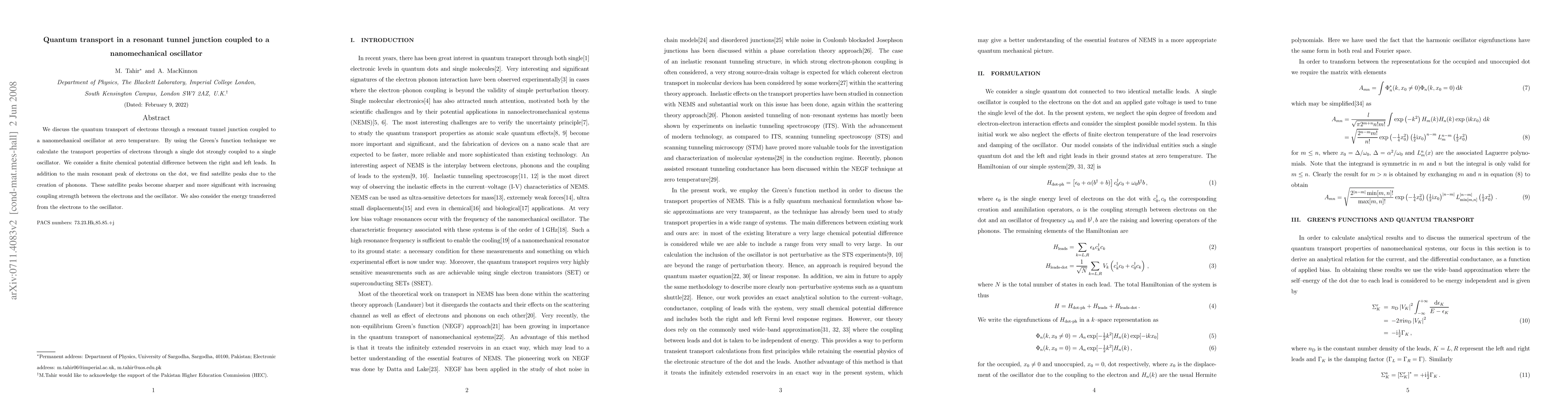 This paper investigates quantum electron transport in a resonant tunnel junction connected to a nanomechanical oscillator using Green's function techniques. It reveals satellite peaks in electron transport due to phonon creation, which become more pronounced with stronger electron-oscillator coupling, alongside energy transfer from electrons to the oscillator.