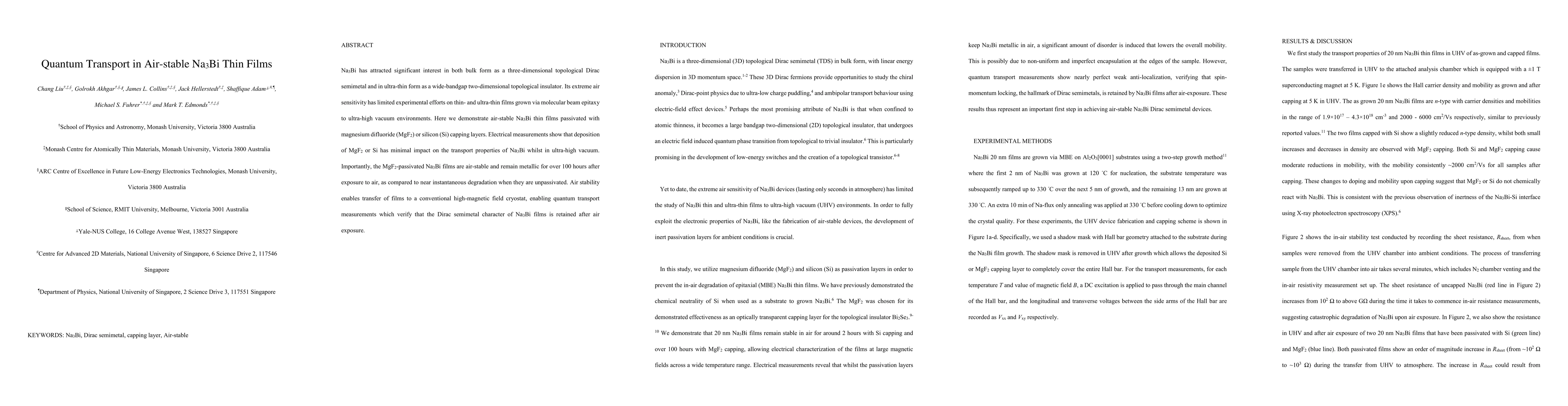 This study presents air-stable Na3Bi thin films passivated with MgF2 or Si, which maintain metallic properties for over 100 hours in air, enabling quantum transport measurements that confirm the preservation of Na3Bi's Dirac semimetal character post-exposure. The passivation layers have minimal impact on Na3Bi's transport properties in ultra-high vacuum conditions.