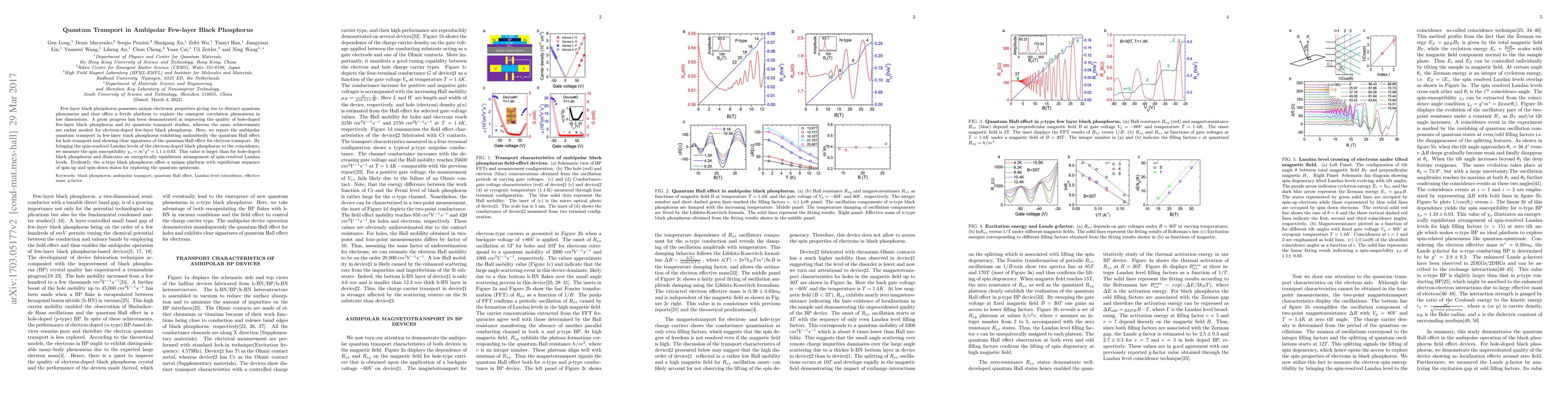 This paper explores ambipolar quantum transport in few-layer black phosphorus, demonstrating the quantum Hall effect in both hole and electron transport. It finds a larger spin susceptibility in electron-doped samples, indicating an equidistant arrangement of spin-resolved Landau levels, which could enhance quantum spintronic applications.