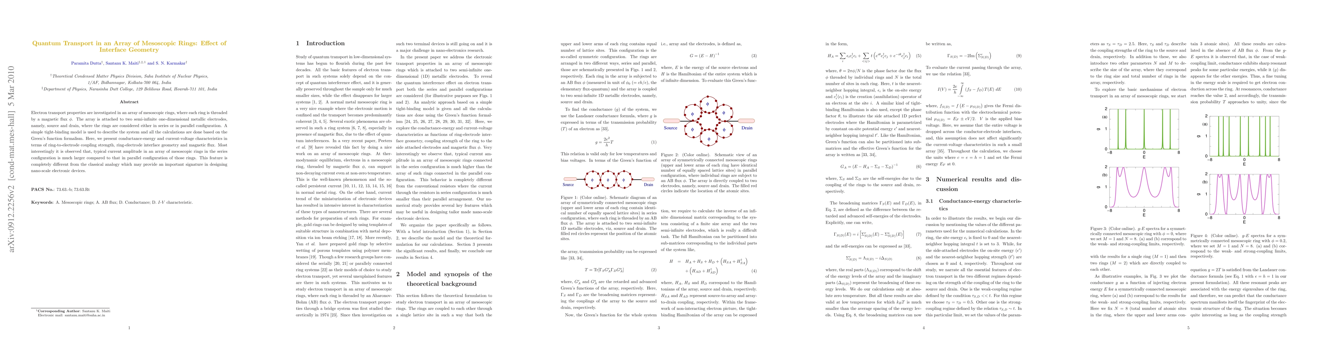 Electron transport properties are investigated in an array of mesoscopic rings, where each ring is threaded by a magnetic flux $\phi$. The array is attached to two semi-infinite one-dimensional metallic electrodes, namely, source and drain, where the rings are considered either in series or in parallel configuration. A simple tight-binding model is used to describe the system and all the calculations are done based on the Green's function formalism. Here, we present conductance-energy and current-voltage characteristics in terms of ring-to-electrode coupling strength, ring-electrode interface geometry and magnetic flux. Most interestingly it is observed that, typical current amplitude in an array of mesoscopic rings in the series configuration is much larger compared to that in parallel configuration of those rings. This feature is completely different from the classical analogy which may provide an important signature in designing nano-scale electronic devices.