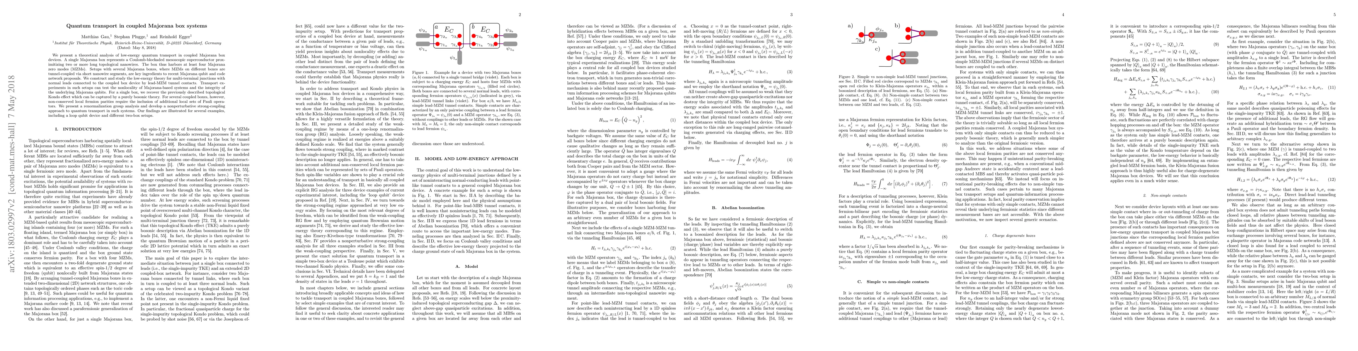 We present a theoretical analysis of low-energy quantum transport in coupled Majorana box devices. A single Majorana box represents a Coulomb-blockaded mesoscopic superconductor proximitizing two or more long topological nanowires. The box thus harbors at least four Majorana zero modes (MZMs). Setups with several Majorana boxes, where MZMs on different boxes are tunnel-coupled via short nanowire segments, are key ingredients to recent Majorana qubit and code network proposals. We construct and study the low-energy theory for multi-terminal junctions with normal leads connected to the coupled box device by lead-MZM tunnel contacts. Transport experiments in such setups can test the nonlocality of Majorana-based systems and the integrity of the underlying Majorana qubits. For a single box, we recover the previously described topological Kondo effect which can be captured by a purely bosonic theory. For several coupled boxes, however, non-conserved local fermion parities require the inclusion of additional local sets of Pauli operators. We present a renormalization group analysis and develop a nonperturbative strong-coupling approach to quantum transport in such systems. Our findings are illustrated for several examples, including a loop qubit device and different two-box setups.