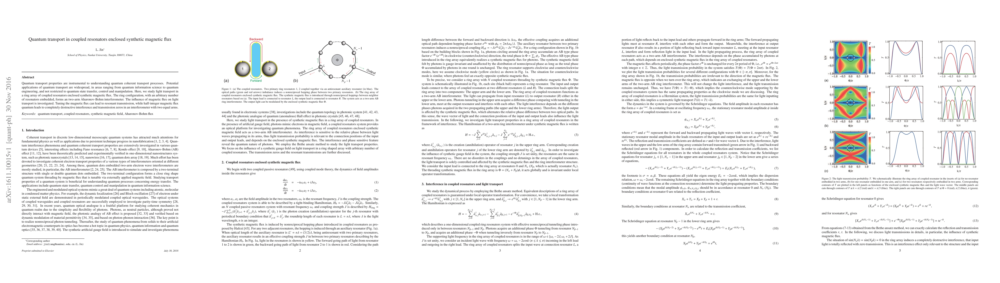 Quantum transport properties are instrumental to understanding quantum coherent transport processes. Potential applications of quantum transport are widespread, in areas ranging from quantum information science to quantum engineering, and not restricted to quantum state transfer, control and manipulation. Here, we study light transport in a ring array of coupled resonators enclosed synthetic magnetic flux. The ring configuration, with an arbitrary number of resonators embedded, forms an two-arm Aharonov-Bohm interferometer. The influence of magnetic flux on light transport is investigated. Tuning the magnetic flux can lead to resonant transmission, while half-integer magnetic flux quantum leads to completely destructive interference and transmission zeros in an interferometer with two equal arms.