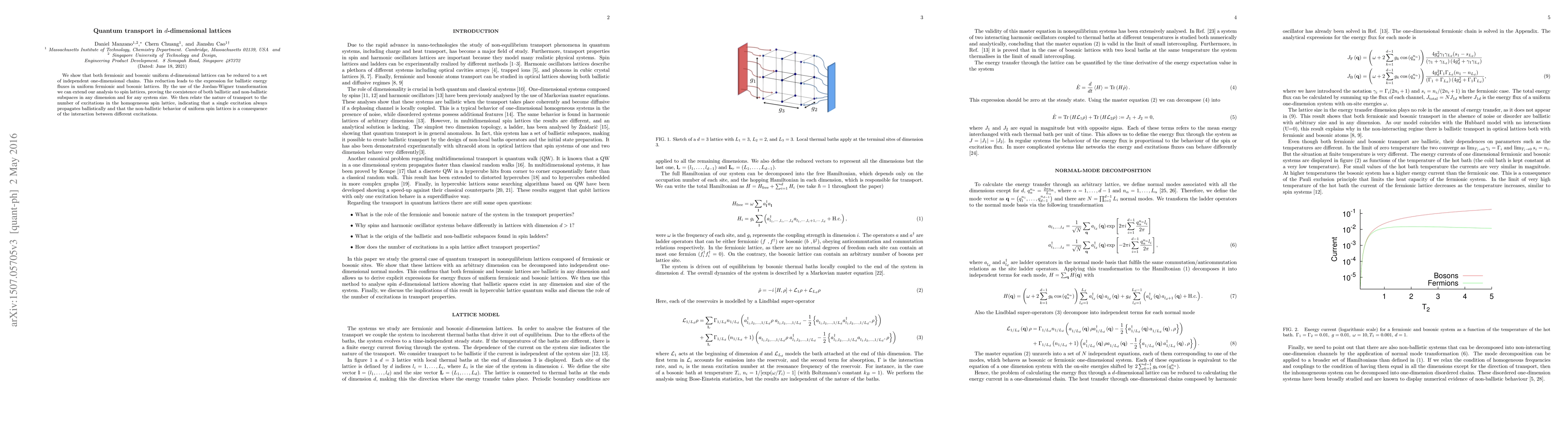 We prove analytically that both fermionic and bosonic uniform d-dimensional lattices can be reduced to a set of independent one-dimensional modes. This reduction leads to the conclusion that the dynamics in uniform fermionic and bosonic lattices is always ballistic. By the use of the Jordan-Wigner transformation we extend our analysis to spin lattices, proving the existence of both ballistic and non-ballistic subspaces in any dimension and for any system size. We then relate the nature of transport with the number of excitations in the spin lattice, indicating that a single excitation propagates always ballistically and that the non-ballistic behavior of uniform spin lattices is a consequence of the interaction between different excitations.