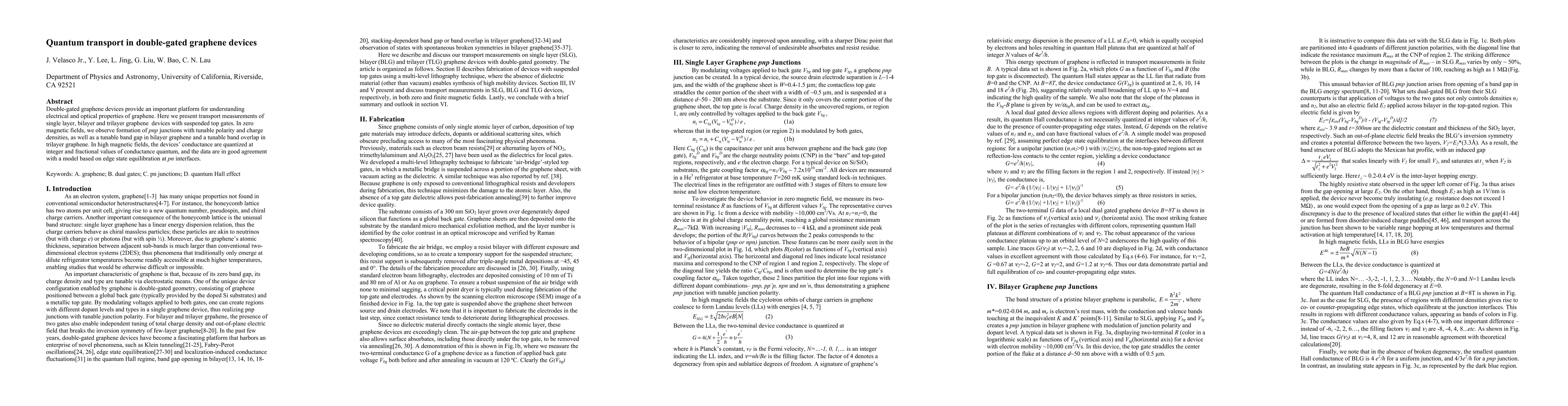 This study investigates quantum transport in double-gated graphene devices, finding tunable pnp junctions, band gaps, and band overlaps, and observing quantized conductance in high magnetic fields, consistent with edge state equilibration models.