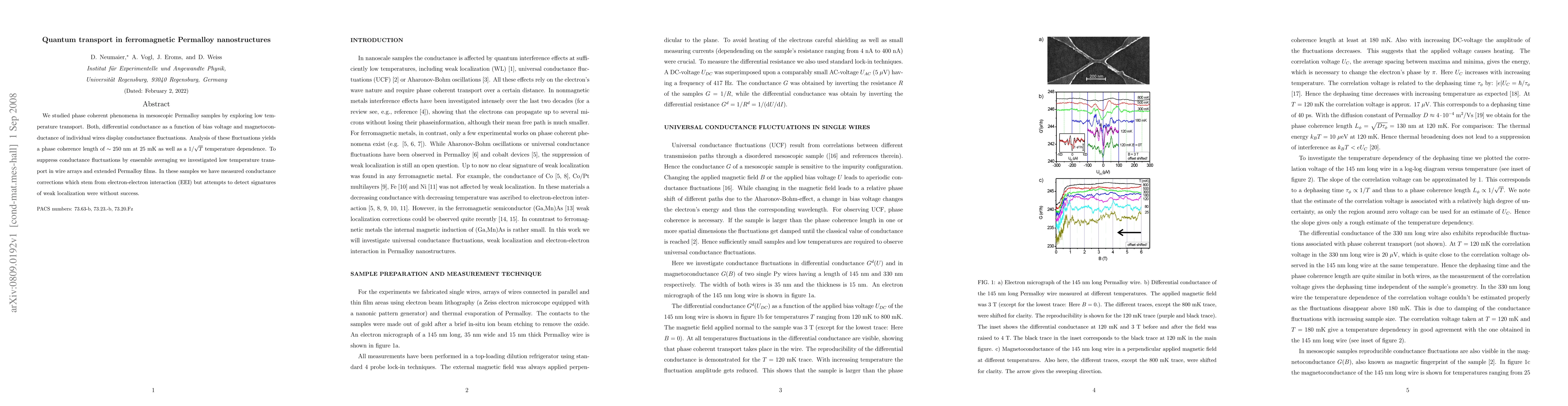 We studied phase coherent phenomena in mesoscopic Permalloy samples by exploring low temperature transport. Both, differential conductance as a function of bias voltage and magnetoconductance of individual wires display conductance fluctuations. Analysis of these fluctuations yields a phase coherence length of $\sim250$ nm at 25 mK as well as a $1/\sqrt{T}$ temperature dependence. To suppress conductance fluctuations by ensemble averaging we investigated low temperature transport in wire arrays and extended Permalloy films. In these samples we have measured conductance corrections which stem from electron-electron interaction (EEI) but attempts to detect signatures of weak localization were without success.