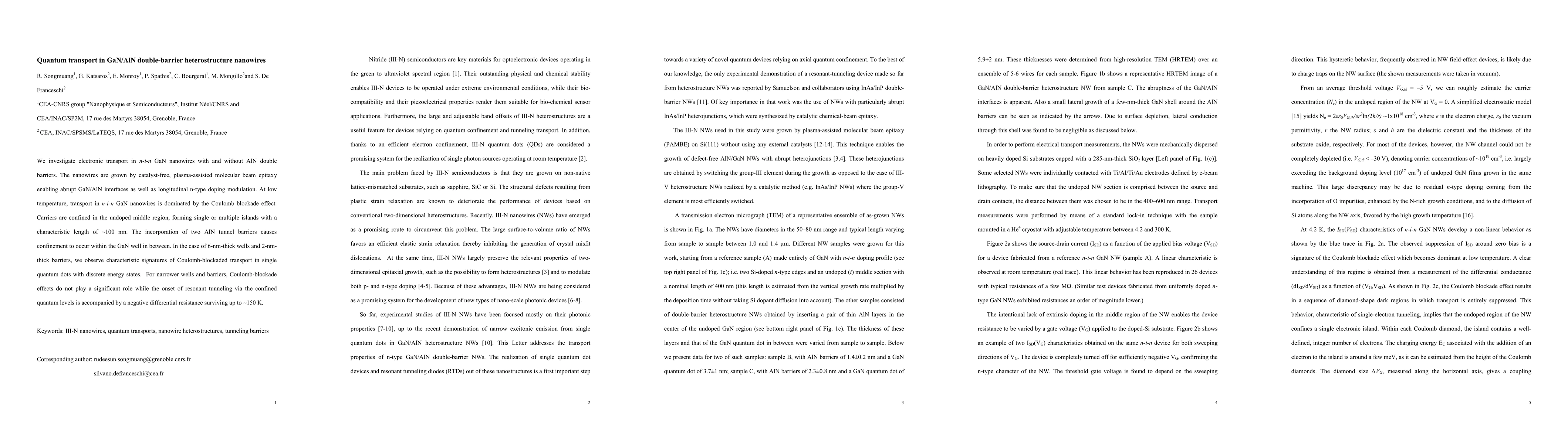 This study explores electronic transport in GaN nanowires with and without AlN double barriers, revealing Coulomb blockade effects at low temperatures and resonant tunneling with negative differential resistance at higher temperatures. The use of catalyst-free, plasma-assisted molecular beam epitaxy allows for precise control over the nanowire structure and doping.
