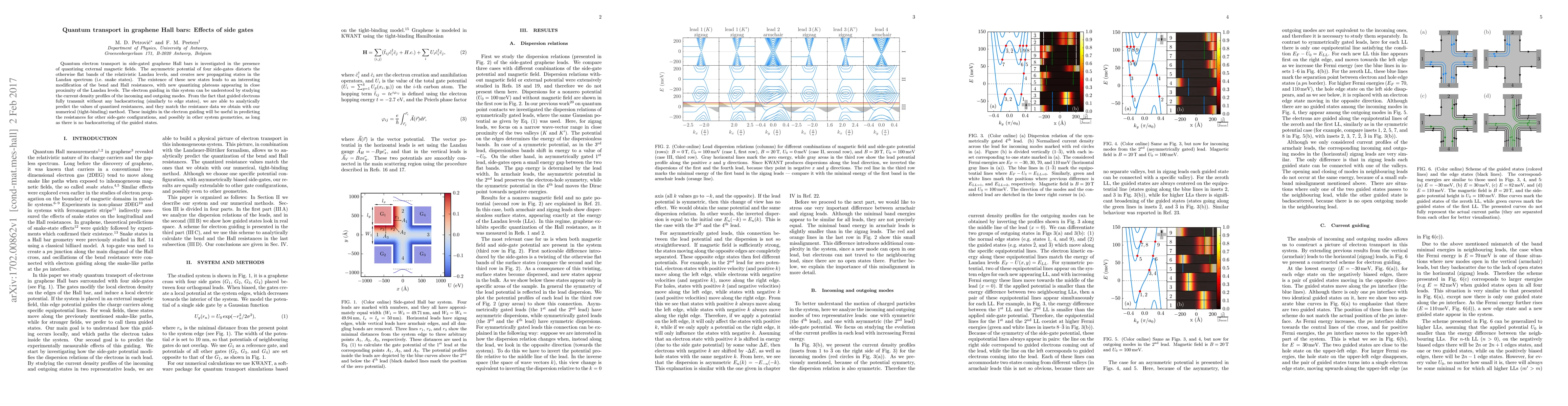 Quantum electron transport in side-gated graphene Hall bars is investigated in the presence of quantizing external magnetic fields. The asymmetric potential of four side-gates distorts the otherwise flat bands of the relativistic Landau levels, and creates new propagating states in the Landau spectrum (i.e. snake states). The existence of these new states leads to an interesting modification of the bend and Hall resistances, with new quantizing plateaus appearing in close proximity of the Landau levels. The electron guiding in this system can be understood by studying the current density profiles of the incoming and outgoing modes. From the fact that guided electrons fully transmit without any backscattering (similarly to edge states), we are able to analytically predict the values of quantized resistances, and they match the resistance data we obtain with our numerical (tight-binding) method. These insights in the electron guiding will be useful in predicting the resistances for other side-gate configurations, and possibly in other system geometries, as long as there is no backscattering of the guided states.