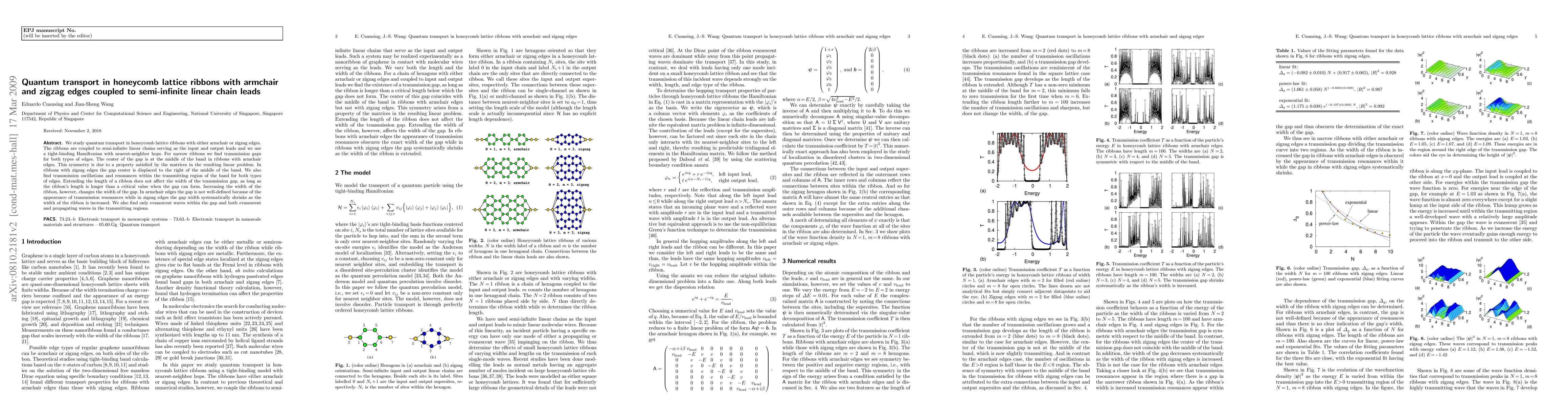 This paper investigates quantum transport in honeycomb lattice ribbons with armchair and zigzag edges, coupled to linear chain leads, revealing transmission gaps and oscillations. The study finds that the gap center in armchair ribbons is symmetric, while in zigzag ribbons it is displaced, with the gap width in zigzag ribbons shrinking with increased ribbon width.