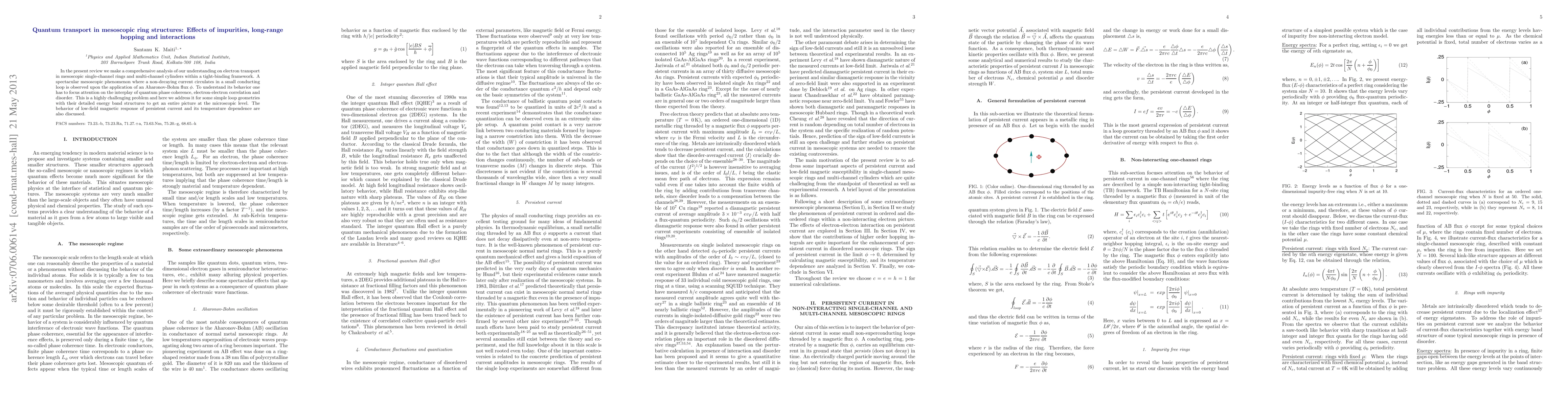 In the present review we make a comprehensive analysis of our understanding on electron transport in mesoscopic single-channel rings and multi-channel cylinders within a tight-binding framework. A spectacular mesoscopic phenomenon where a non-decaying current circulates in a small conducting loop is observed upon the application of an Aharonov-Bohm flux $\phi$. To understand its behavior one has to focus attention on the interplay of quantum phase coherence, electron-electron correlation and disorder. This is a highly challenging problem and here we address it for some simple loop geometries with their detailed energy band structures to get an entire picture at the microscopic level. The behavior of low-field magnetic response of persistent current and its temperature dependence are also discussed.