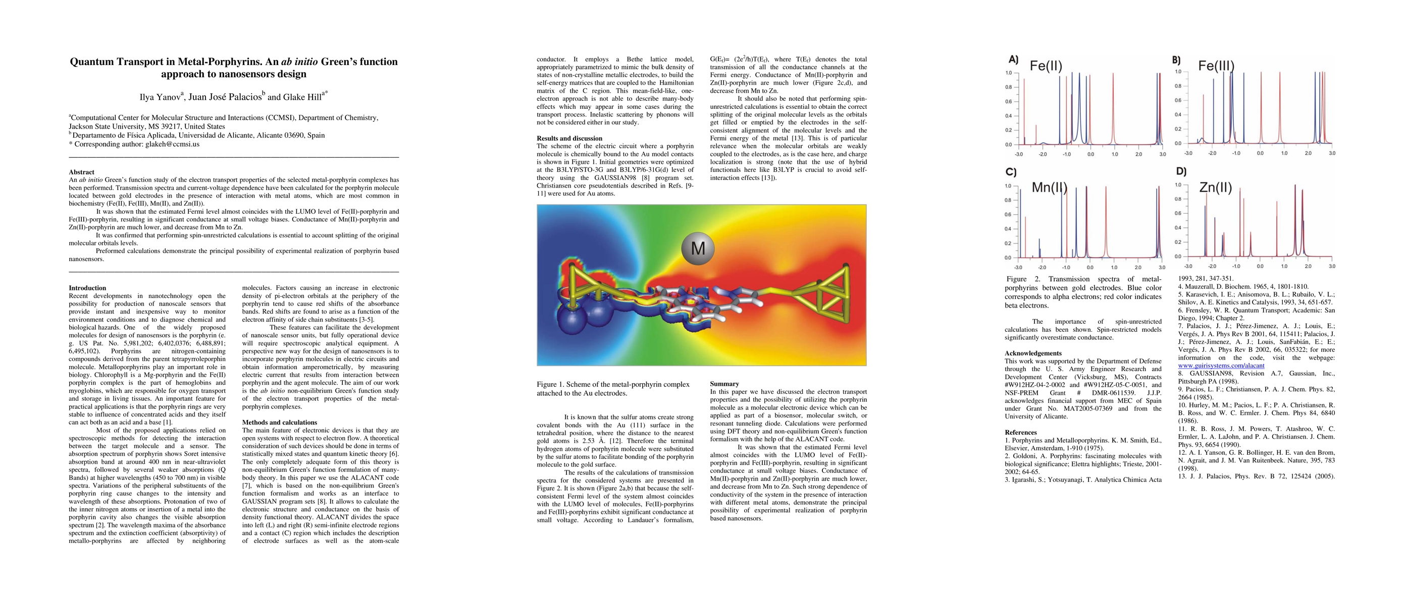 This study uses ab initio Green's function methods to analyze electron transport in metal-porphyrin complexes between gold electrodes, revealing significant conductance in Fe(II) and Fe(III) complexes due to alignment of Fermi and LUMO levels. Spin-unrestricted calculations are crucial for accurate conductance predictions, highlighting the potential for porphyrin-based nanosensors.