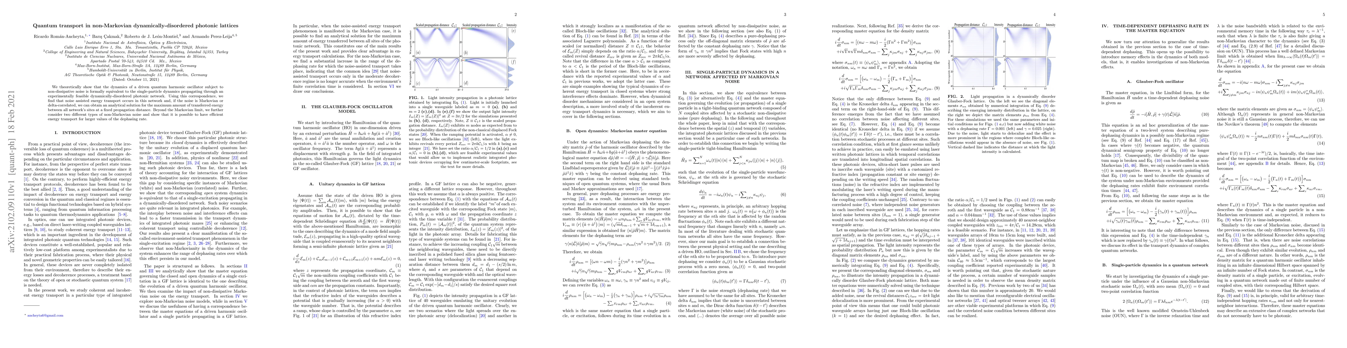 This paper theoretically demonstrates that a driven quantum harmonic oscillator under non-dissipative noise behaves similarly to a single-particle in a dynamically-disordered photonic network. It finds that noise-assisted energy transport is possible, with analytical solutions for maximum energy transfer under Markovian noise, and explores efficient energy transport under non-Markovian conditions for larger dephasing rates.
