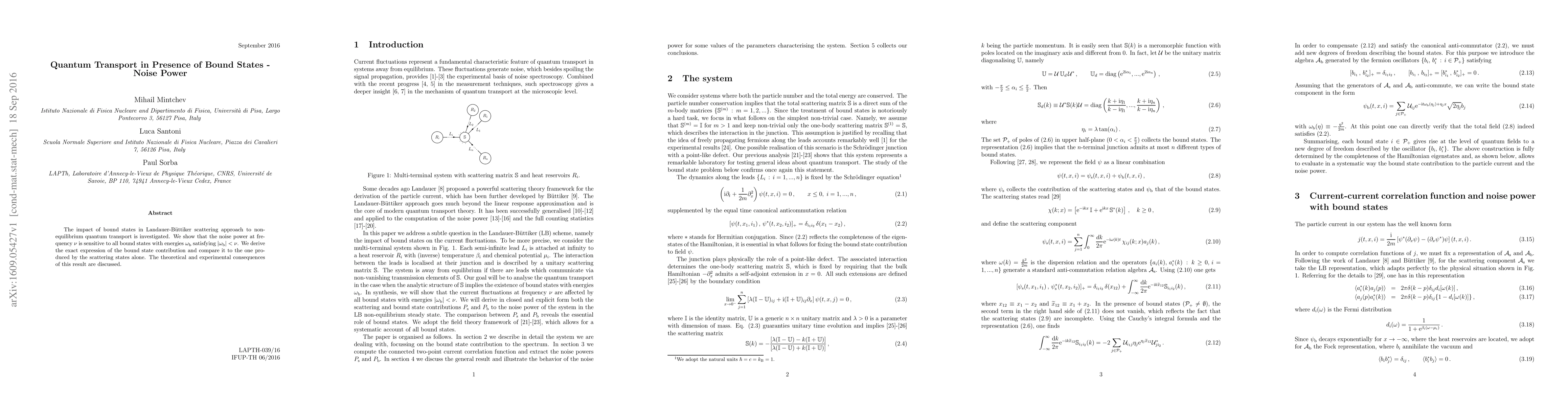 The impact of bound states in Landauer-Buttiker scattering approach to non-equilibrium quantum transport is investigated. We show that the noise power at frequency $\nu$ is sensitive to all bound states with energies $\omega_b$ satisfying $|\omega_b| < \nu$. We derive the exact expression of the bound state contribution and compare it to the one produced by the scattering states alone. It turns out that the bound states lead to specific modifications of both space and frequency dependence of the total noise power. The theoretical and experimental consequences of this result are discussed.