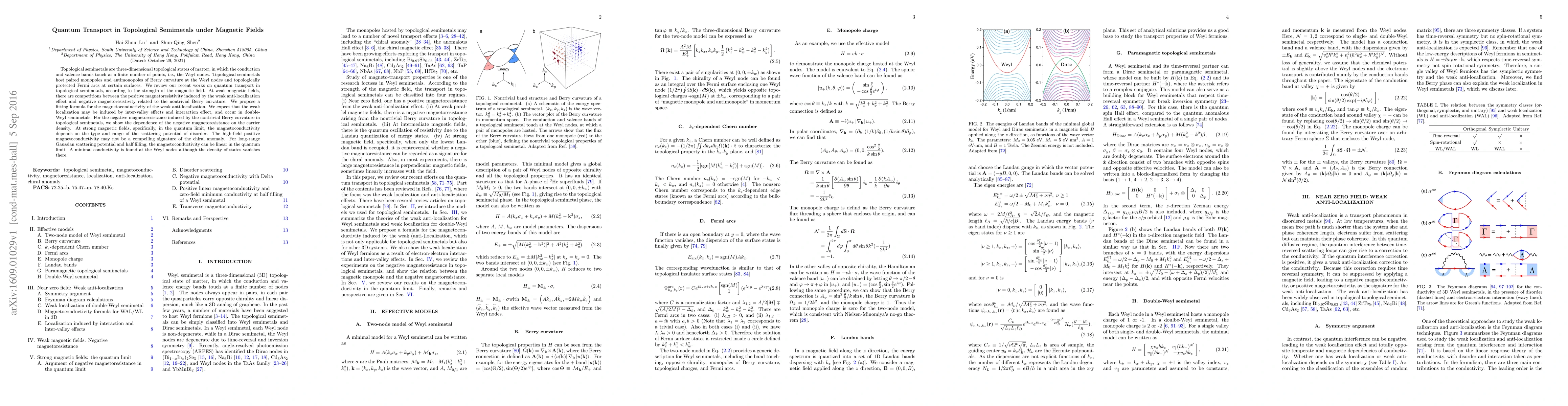 This paper reviews quantum transport in topological semimetals under varying magnetic field strengths. At weak fields, it explores the competition between positive and negative magnetoresistivity, proposing a formula for weak anti-localization. At strong fields, it examines the dependence on scattering potential and concludes that high-field positive magnetoconductivity may not signal the chiral anomaly, with minimal conductivity found at Weyl nodes.